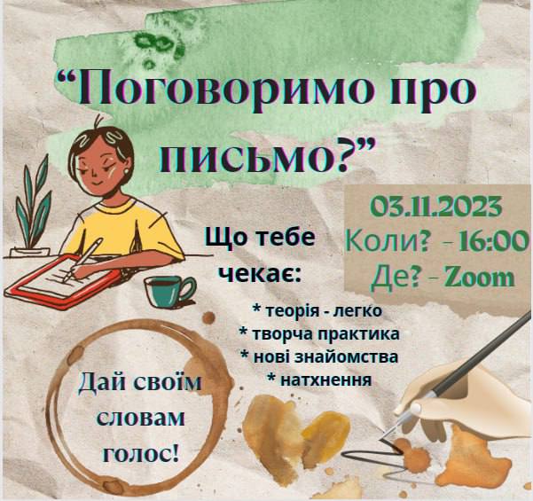 Час летить невпинно, і ось 03.11.23 абсолютно самостійний захід літтворців другого курсу, які скоро захищатимуть свої магістерські дослідження. Дар’я Картавченко, Єлизавета Сушкова, Вікторія Тютюн, Ілля Савченко працювали з текстами переможців конкурсу «Березневі містерії-2023», уклали їх в антологію «Між сторінок війни», організували зустріч з авторами, тексти яких потребували авторського доопрацювання. Сьогодні відбулась творча зустріч «Поговоримо про письмо?» Легко про теорію, натхненно про практику, невимушено про себе.