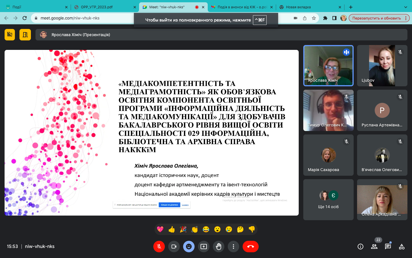 09 листопада 2023 року, у межах заходів до Всесвітнього дня науки, викладачі кафедри інформаційних комунікацій та здобувачі освіти долучилися до ІV Всеукраїнської науково-практичної конференції «Культурні та мистецькі студії ХХІ століття: науково-практичне партнерство» (організатор – партнер Університету Грінченка – Національна академії керівних кадрів культури і мистецтв). Конференція відбулася онлайново у форматі пленарного та секційних засідань і круглого столу.