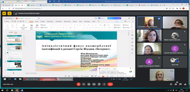 Пленарне засідання модерувала Тетяна Вірченко, доктор філологічних наук, професор, професор кафедри української літератури, компаративістики і грінченкознавства. Свої доповіді презентували Оксана Гальчук, професор, доктор філологічних наук, професор кафедри світової літератури; Юлія Вишницька, доктор філологічних наук, доцент, доцент кафедри світової літератури; Тетяна Горохова, кандидат педагогічних наук, старший викладач, доцент кафедри української мови; Марія Бойко, доктор філософії, старший викладач кафедри української мови, заступник голови Наукового товариства студентів, магістрантів, аспірантів і молодих учених Факультету української філології, культури і мистецтва; Лідія Король, аспірантка II року навчання, спеціальності «035 Філологія», викладач кафедри української літератури, компаративістики і грінченкознавства; Тамара Федик, аспірантка I року навчання, спеціальності «035 Філологія», викладач кафедри української літератури, компаративістики і грінченкознавства; Андрій Журба, здобувач IV року навчання, першого (бакалаврського) рівня вищої освіти, спеціальності «035 Філологія» Факультету східних мов Київського університету імені Бориса Грінченка.