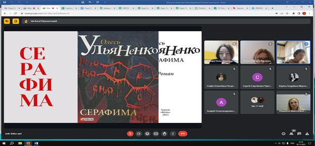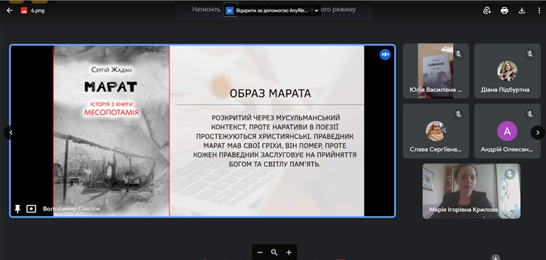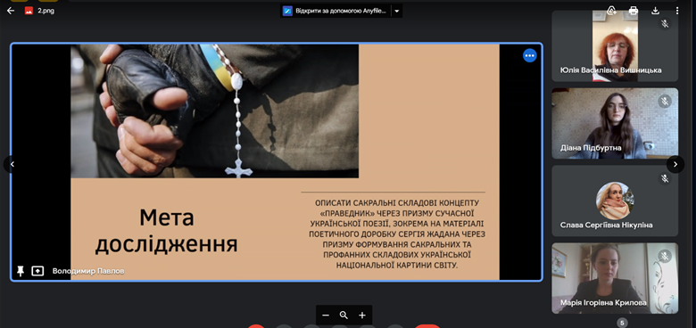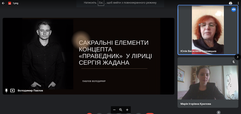 На Секції 1 («Історико-культурні аспекти творчості українських письменників. Стильове розмаїття української і світової прози. Генологія літератури: взаємовпливи й еволюція») Володимир Павлов, аспірант Навчально-наукового інституту філології Київського національного університету імені Тараса Шевченка проаналізував сакральні елементи концепту праведника в ліриці Сергія Жадана, виокремивши в ній, зокрема, образ Марата, який розкривається через мусульманський контекст поезій, у якій репрезентовано християнські мотиви; Марія Крилова, здобувачка IV курсу, першого (бакалаврського) рівня вищої освіти, спеціальності «035 Філологія» дослідила і представила для обговорення систему текстових засобів та авторських прийомів зображення стану закоханості в трилогії Ірини Вільде «Метелики на шпильках»; Діана Підбуртна проаналізувала простір у романі «Район Д» Артема Чеха, описавши його символіку та ідіостильові особливості, зокрема атмосферу безвиході та співвідношення «свій-чужий» у хронотопі «місця – не-місця»; Ярослава Нікуліна, магістрантка Університету Грінченка, дослідила драматургію Анни Багряної, виокремивши провідні діалогічні моделі у її драмах, а саме: діалог із часом, діалог із родинною пам’яттю, діалог з видатною історичною постаттю тощо.