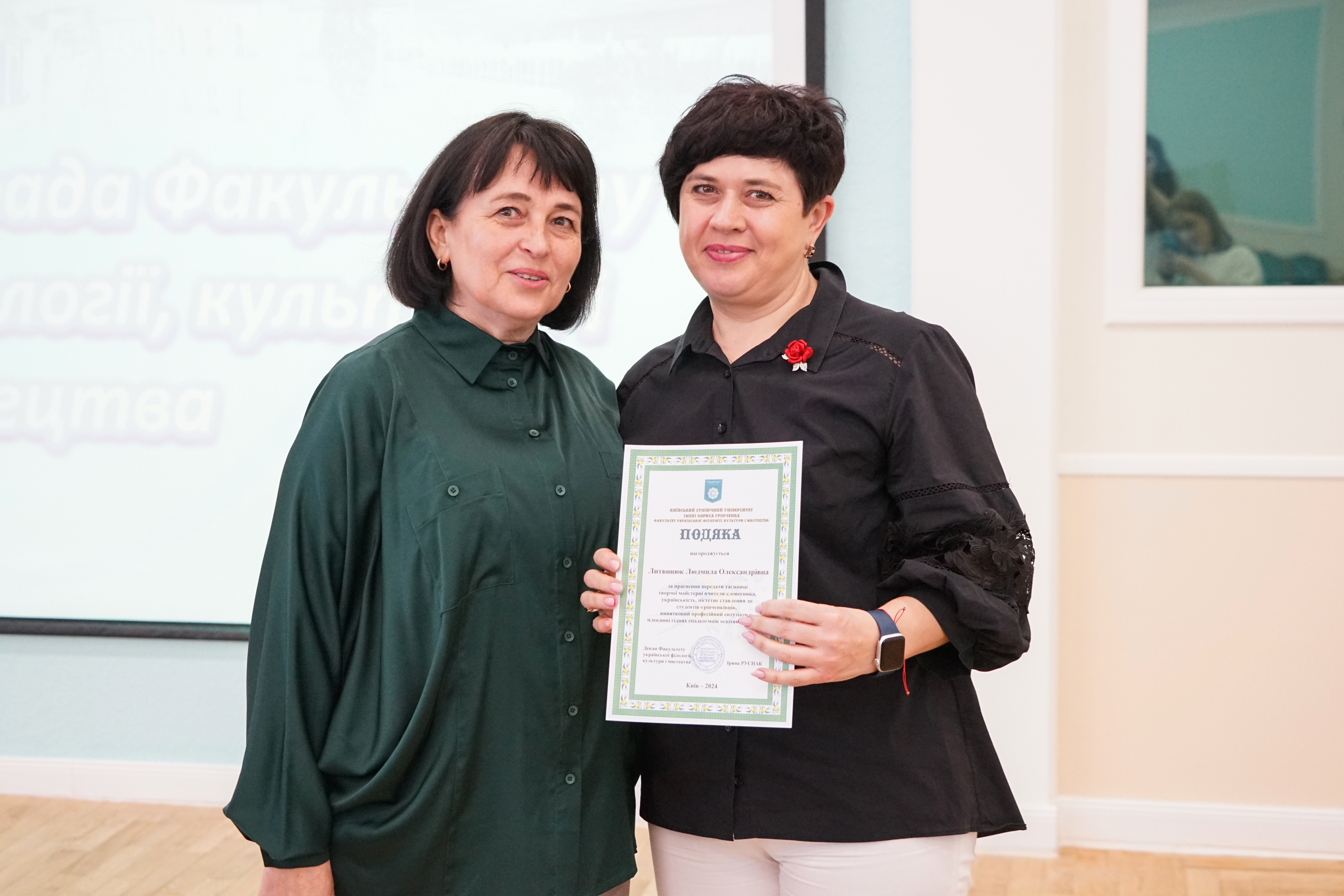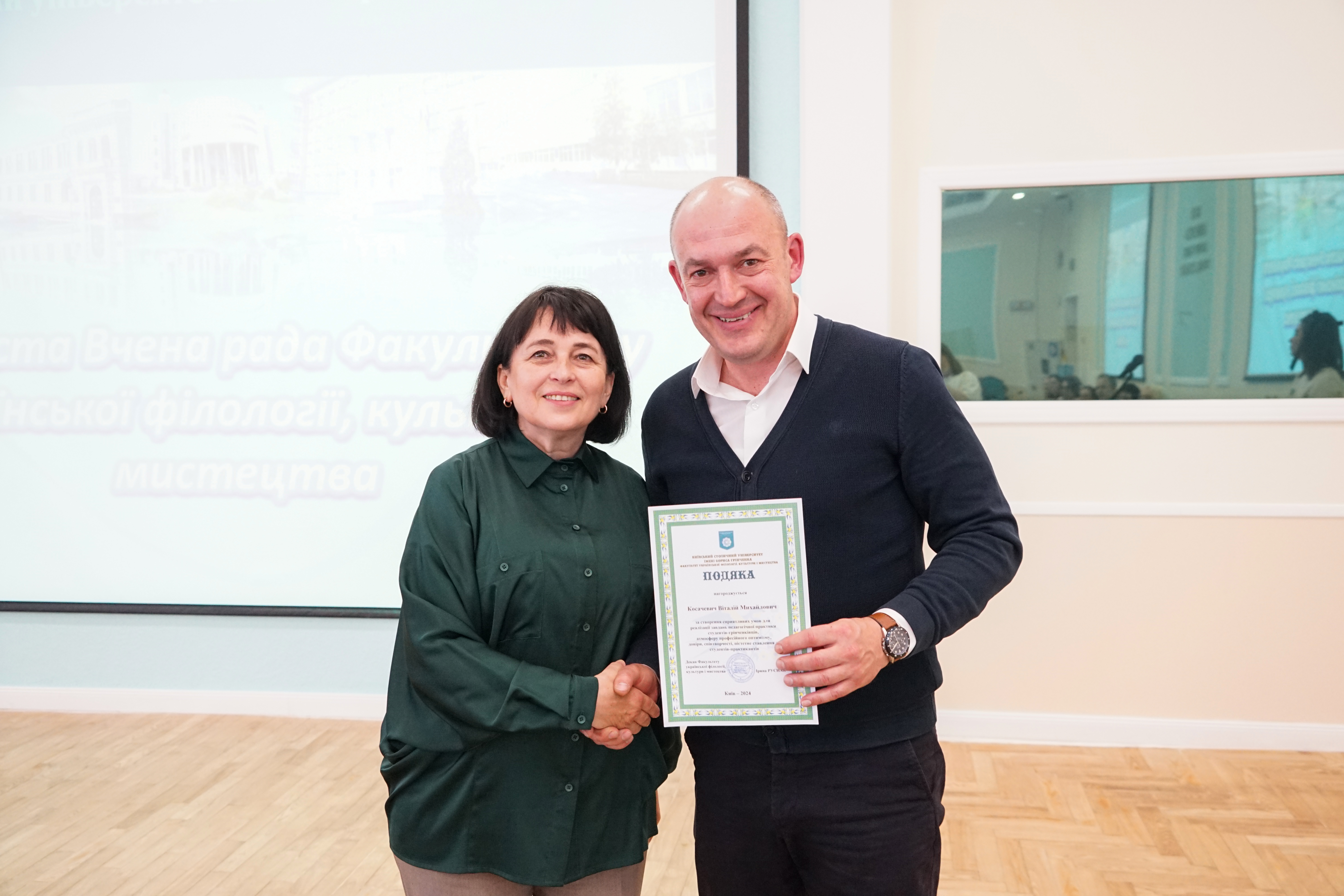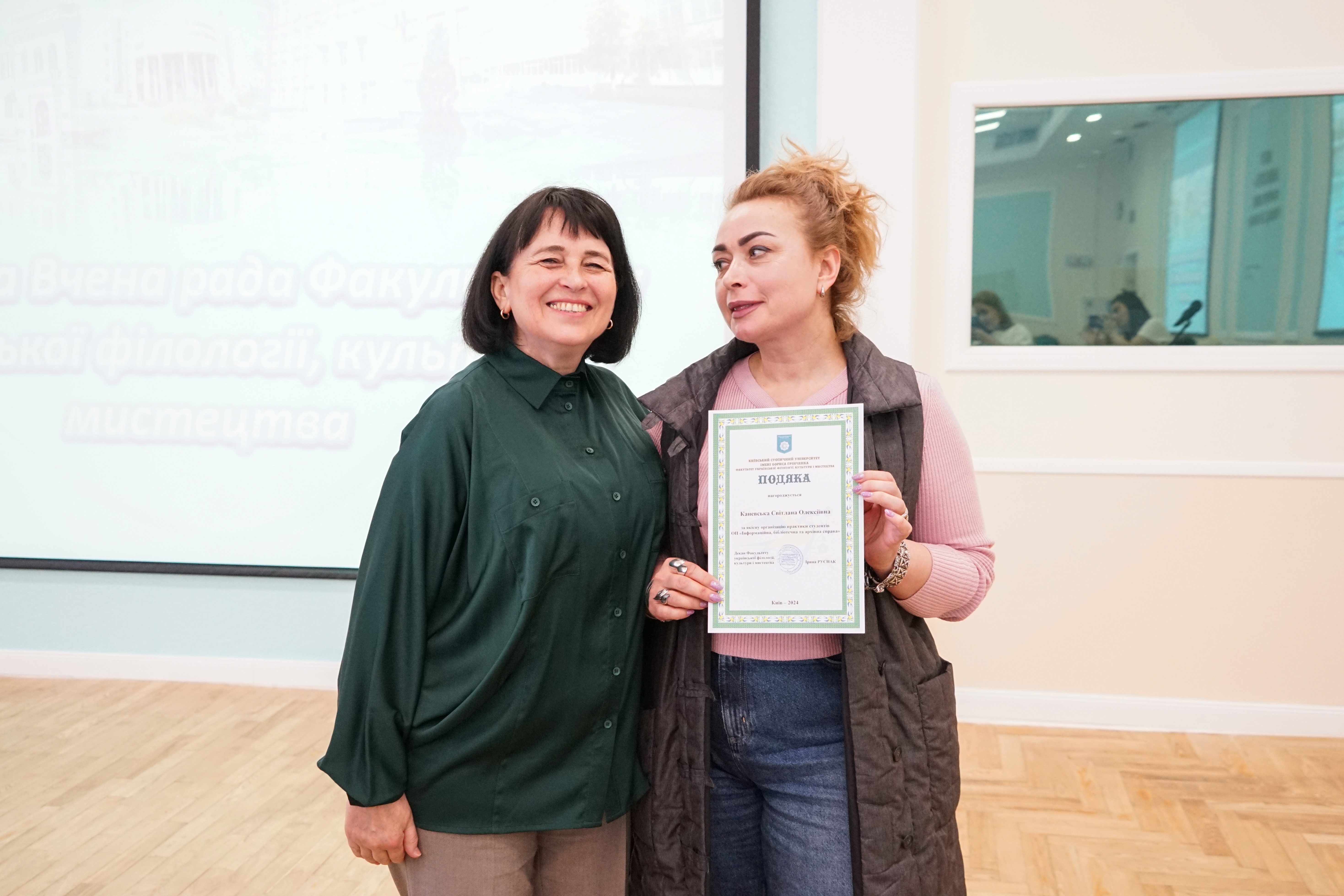 Вітальним словом розпочала зібрання голова Вченої ради, доктор філологічних наук, професор Ірина Руснак та вручила подяки партнерам Факультету за підтримку цінностей грінченківської родини, готовність реалізовувати креативні проєкти, тривалу співпрацю у підготовці здобувачів вищої освіти, забезпечення наукової атестації кадрів вищої кваліфікації, створення сприятливих умов для реалізації завдань практики та профорієнтації, атмосферу довіри, співтворчості, професійного оптимізму Світлані Каневській, в.о. директора наукової бібліотеки ім. Михайла Максимовича Київського національного університету імені Тараса Шевченка; Ользі Романюк, директору Публічної бібліотеки імені Лесі Українки для дорослих міста Києва; Тамарі Кулієвій, ученому секретареві Національної наукової медичної бібліотеки України; Володимиру Попику, директору Інституту біографічних досліджень Національної бібліотеки України імені В.І. Вернадського; Марині Штолько, завідувачу Науково-інформаційного відділу Інституту літератури ім. Т. Г. Шевченка НАН України; Олені Романенко, заступнику директора з науково-педагогічної роботи Навчально-наукового інституту філології Київського національного університету імені Тараса Шевченка; Лідії Кавун, професору кафедри української літератури Черкаського національного університету імені Богдана Хмельницького; Оксані Філатовій, завідувачу кафедри соціально-гуманітарних дисциплін Національного університету кораблебудування ім. адмірала Макарова; Володимирові Кузьменку, професорові кафедри східноєвропейських мов Національної академії Служби безпеки України; Михайлові Гнатюку, професорові кафедри теорії літератури та порівняльного літературознавства Львівського національного університету імені Івана Франка; Альбертові Новацкому, доцентові Інституту літературознавства Люблінського католицького університету Яна Павла II, м. Люблін, Республіка Польща; Олегові Сербіну, в. о. генерального директора Національної бібліотеки України імені Ярослава Мудрого; керівникам і вчителям спеціалізованої школи № 194 «Перспектива» Віталію Косачевичу, Наталії Білодід, Ользі Макаровій, Наталії Гунько, Ларисі Швець, Тетяні Рощенко, Євгенії Андрієнко; керівникам і вчителям школи І-ІІІ ступенів № 249 м. Києва Пилипові Пилипенку, Світлані Шиш, Олександрові Літашу, Валентині Луценко та Ользі Павленко; учителю іноземних мов і зарубіжної літератури школи І-ІІІ ступенів №245 м. Києва Ніці Явиць; керівникам і вчителям гімназії №283 ВГКДО «Дніпровська січ» м. Києва Володимирові Гнатюку, Ларисі Сівковській, Марії Швед, Аллі Усатій, Наталії Мухіній-Швець, Людмилі Литвинюк, Катерині Єршовій та Вікторії Дмитренко; керівникам і вчителям спеціалізованої школи № 252 імені Василя Симоненка м. Києва Олені Преподобній, Марії Кривицькій, Олені Ніколаєнко, Юлії Дрожжиній, Юрію Ільченкові, Людмилі Мартиненко, Світлані Борковській, Тетяні Яковчук та Ніні Лимар.