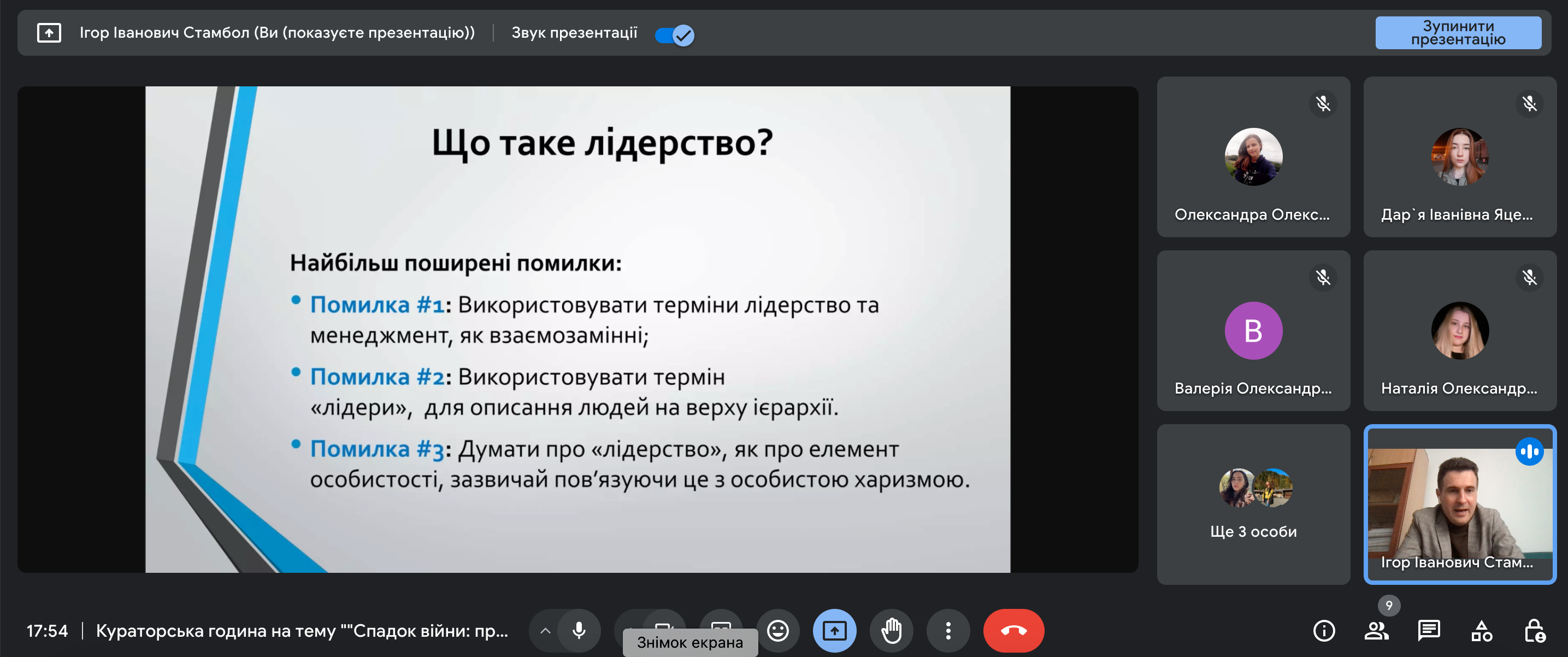 Окреслений напрям кураторських годин охоплює не лише питання лідерства, корпоративної культури, але й етику, толерантність, комунікацію, психологічну підтримку в умовах війни, інші аспекти взаємодії в університетському середовищі, що свідчить про прагнення учасників освітнього процесу створювати гармонійне середовище, де кожен може розвиватися як особистість, сприяючи загальному успіху Університету.