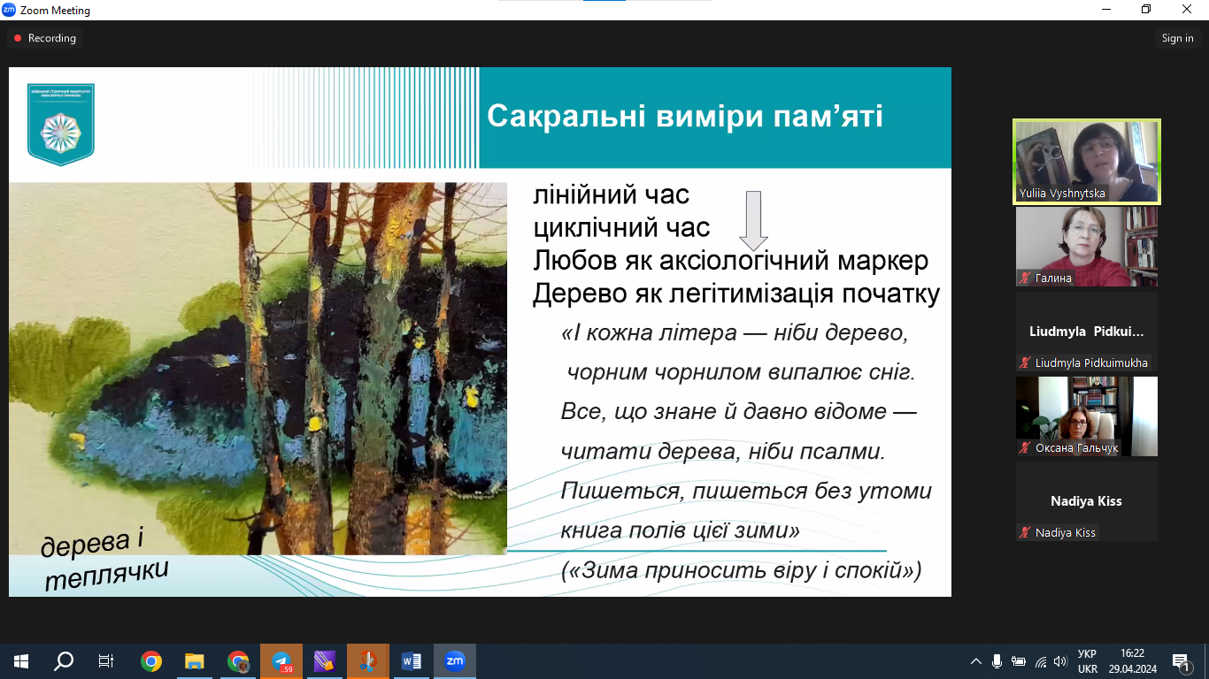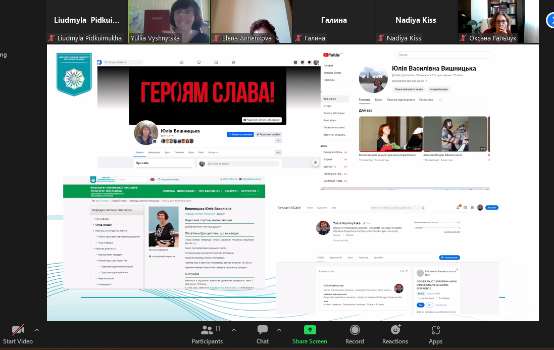 29 квітня 2024 р. доцент кафедри світової літератури, доктор філологічних наук Юлія Вишницька прочитала публічну лекцію «Світ, прошитий хірургічними швами кирилиці: поетична візія пам’яті в текстах Сергія Жадана». Захід організовано відповідно до плану співпраці кафедри світової літератури з міжнародною спільнотою науковців Vision Ukraїne. Netzwerk: Bildung, Sprache & Migration, місією якої є ревізія знань про Україну в німецькому науковому, медіальному й суспільному дискурсах. Лекція викликала жваву півторагодинну дискусію. До обговорення тез, а також спровокованої проблематики долучилися учасники міжнародного наукового об'єднання "Візія України" й колеги з різних українських університетів, зокрема професор Олена Анненкова (Український державний університет імені Михайла Драгоманова), професор Наталія Торкут (Запорізький національний університет) та ін. Модерувала захід Надія Кісс, співзасновник Interdisziplinär