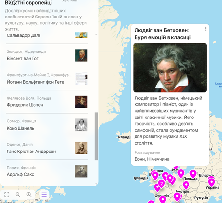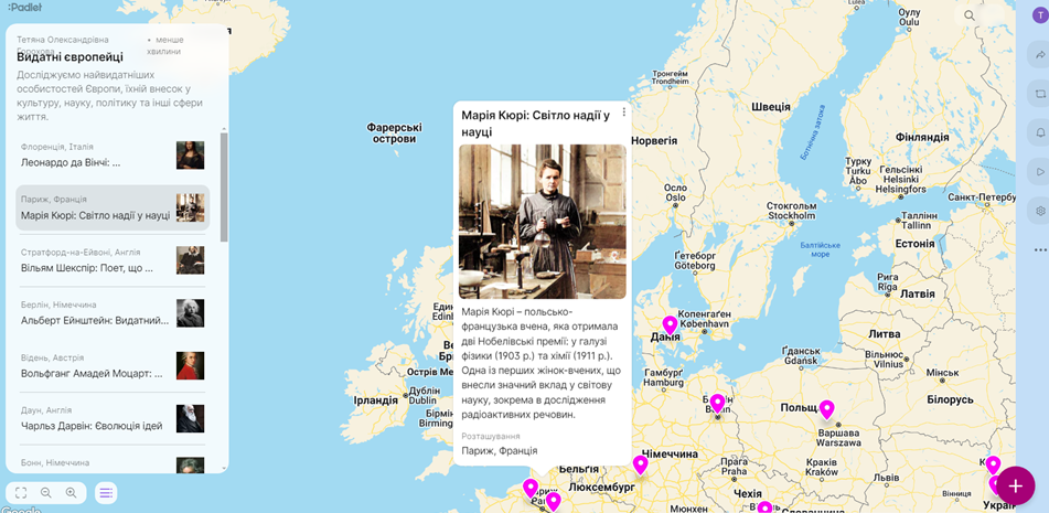 Відзначаючи День Європи, студенти і викладачі Факультету української філології, культури і мистецтва Київського столичного університету імені Бориса Грінченка створили інтерактивну мапу "Видатні європейці" (модератори - викладачі кафедри української мови Т.Горохова, Н.Лахно, М.Бойко). Європа подарувала світові велику кількість талановитих людей. З-поміж них - видатні вчені, винахідники, політики, громадські діячі, письменники, музиканти, художники, спортсмени, архітектори. Саме вони творили історію і зрештою змінили світ.