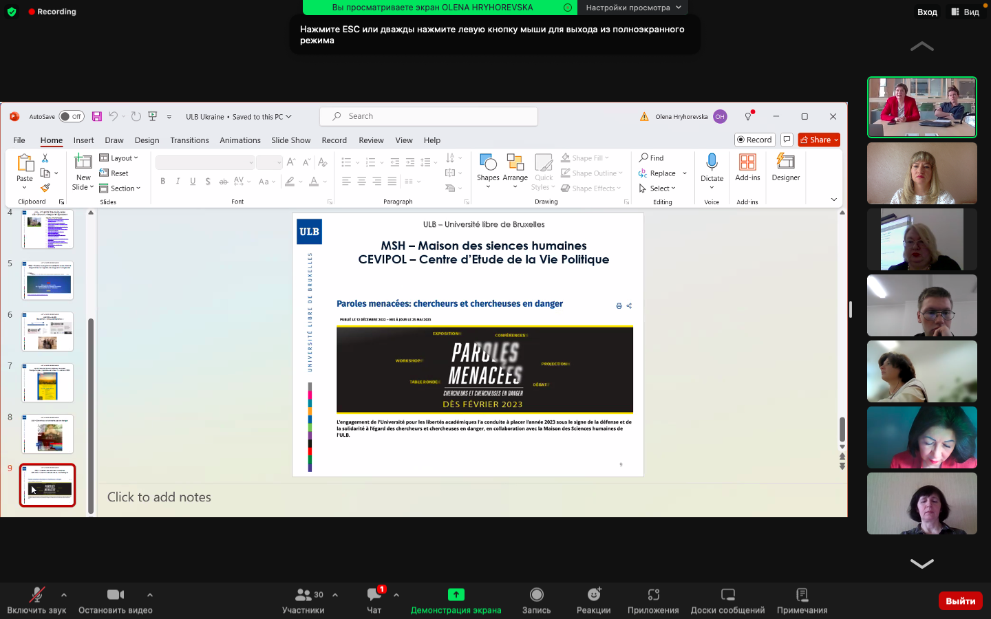 Оксана Козлова, викладач Департаменту перекладів Факультету літератури, перекладу та комунікації ULB, представила основні проєкти, що реалізує або підтримує університет у співпраці з іншими європейськими організаціями, зокрема Європейською мережею солідарності з Україною, Інститутом європейських досліджень та ін. (виставкова діяльність, започаткування кінолекторію «Час України – подорож українським кіно» з перегляду українських фільмів (за підтримки Довженко-центру у Києві та фінансування Культурної комісії ULB), відкриття вечірніх курсів вивчення української мови тощо).
