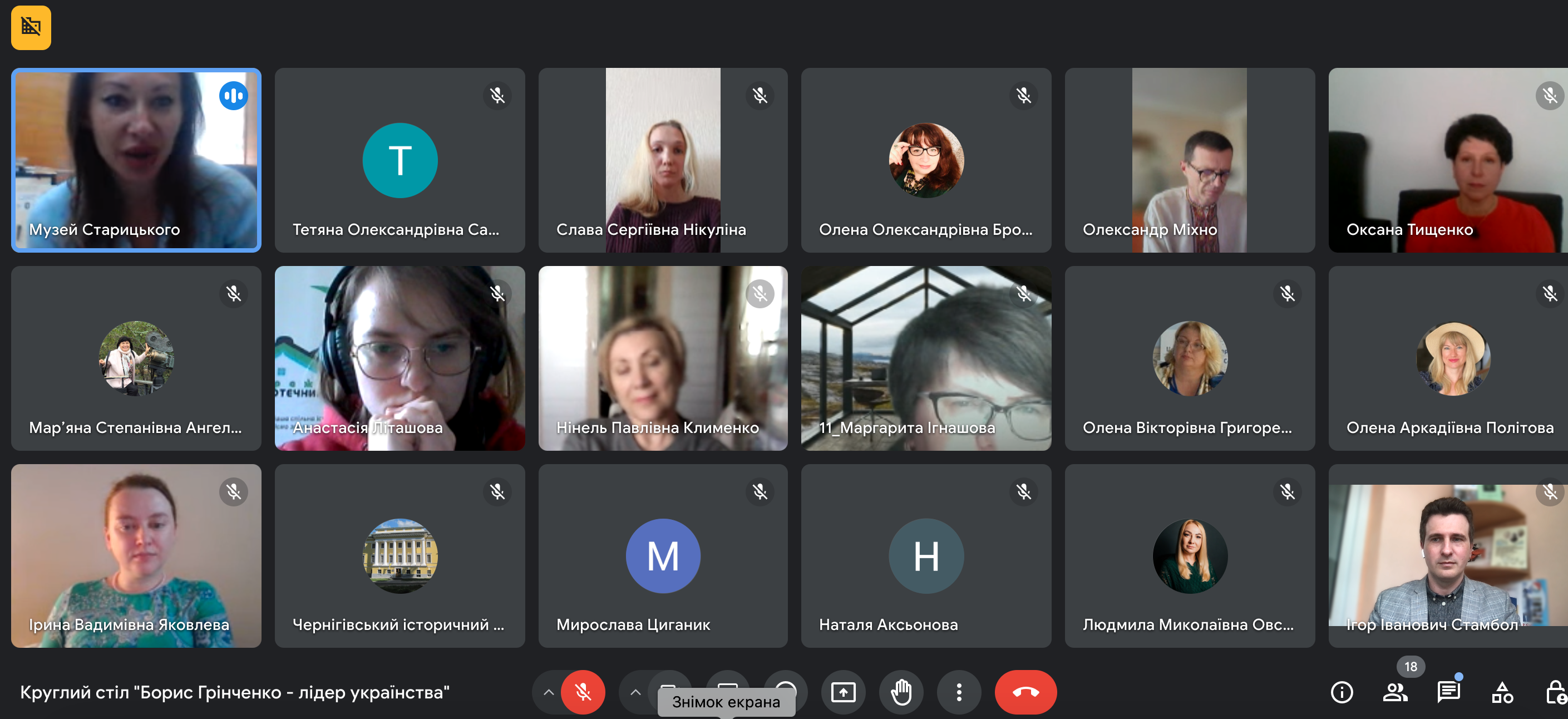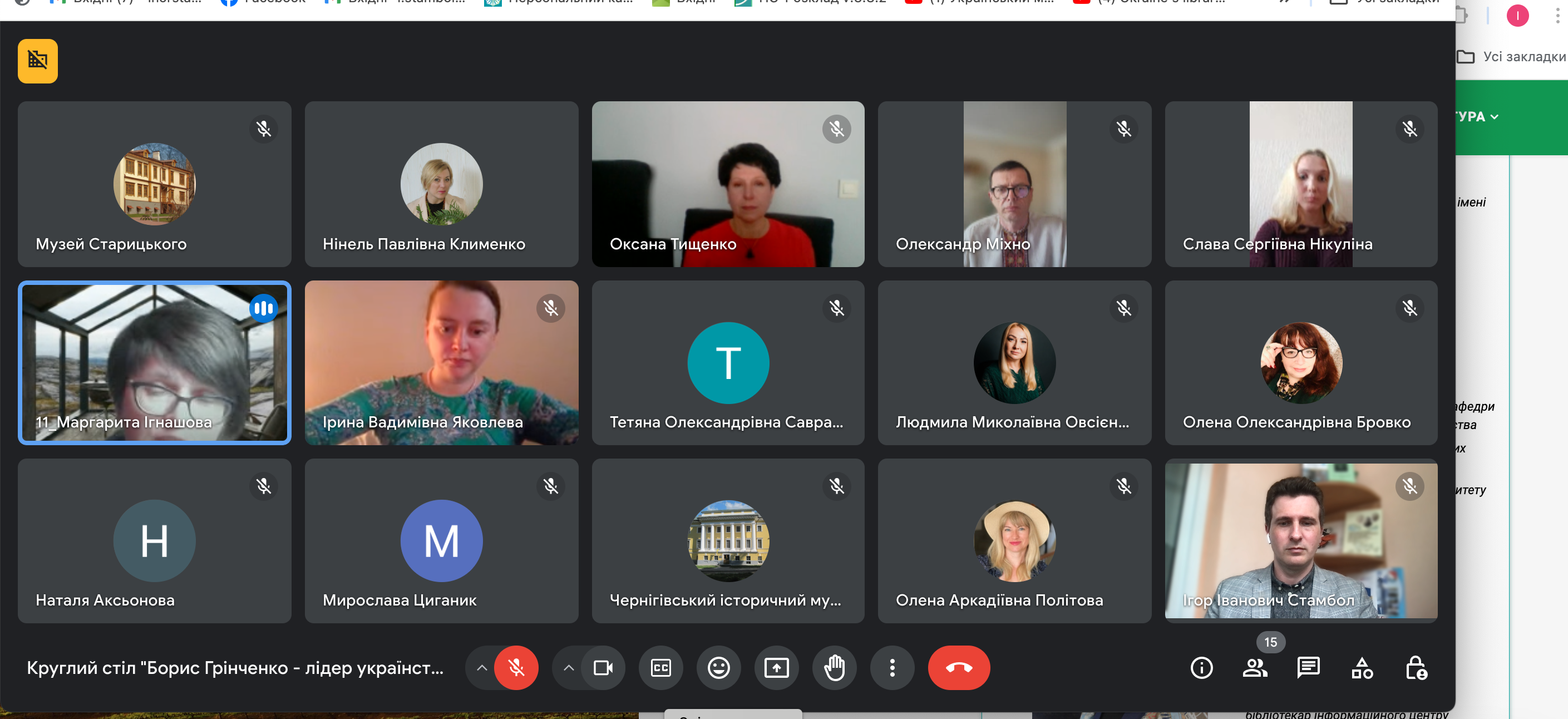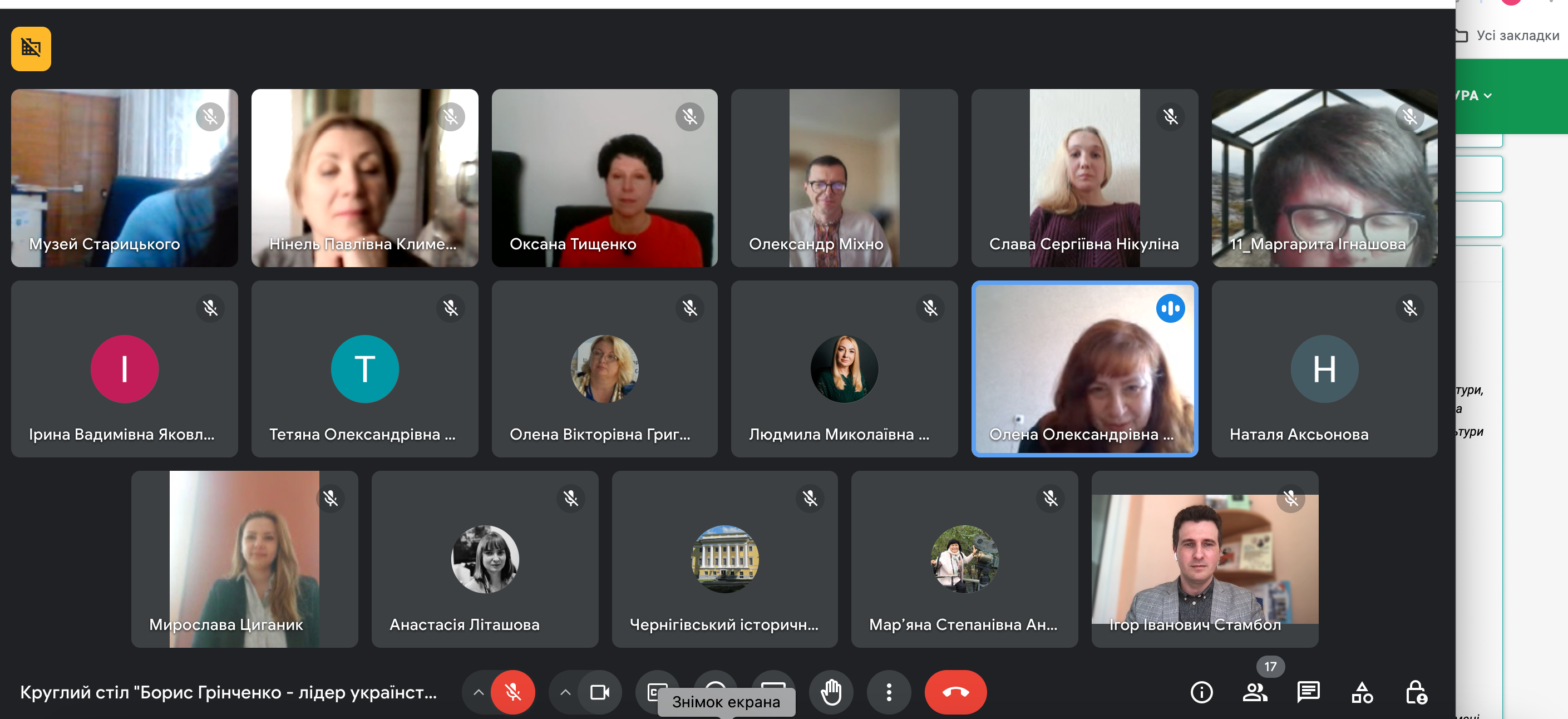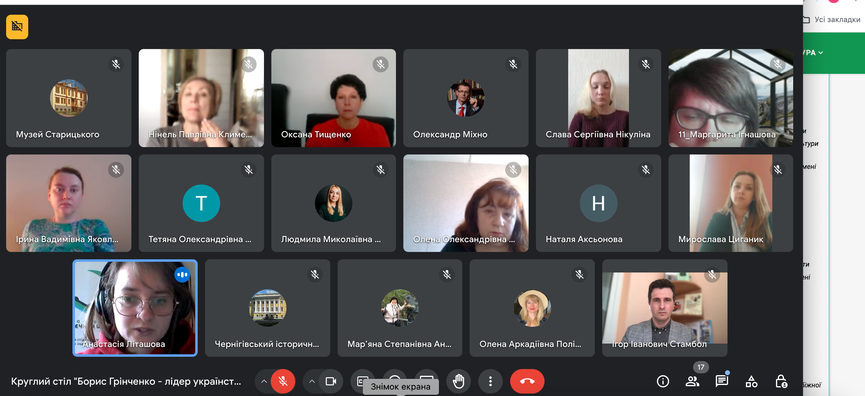 Інформацією про значення постаті й діяльності Бориса Грінченка в різних містах України поділилися учасники круглого столу, які представляють наукові та інформаційні установи Києва, Харкова, Львова, Чернігова, Херсону та Луганська (тимчасово переміщена). Колеги висловили слушні пропозиції, зауваження й погляди щодо організації і проведення Конкурсу (Олександр Міхно, доктор педагогічних наук, директор Педагогічного музею України; Ольга Гураль, кандидат історичних наук, директор Музею видатних діячів української культури; Анастасія Літашова, заступник директора Луганської обласної універсальної наукової бібліотеки; Оксана Тищенко, кандидат філологічних наук, доцент, старший науковий співробітник відділу лексикології, лексикографії та структурно-математичної лінгвістики Інституту української мови НАН України; Мирослава Циганик, кандидат філологічних наук, в.о. декана Факультету культури і мистецтв Львівського національного університету імені Івана Франка; Олена Бджола, бібліотекар інформаційного центру Херсонської обласної універсальної наукової бібліотеки імені Олеся Гончара; Наталя Аксьонова, кандидат історичних наук, доцент кафедри туристичного бізнесу та країнознавства Факультету міжнародних економічних відносин та туристичного бізнесу Харківського національного університету імені Василя Назаровича Каразіна).