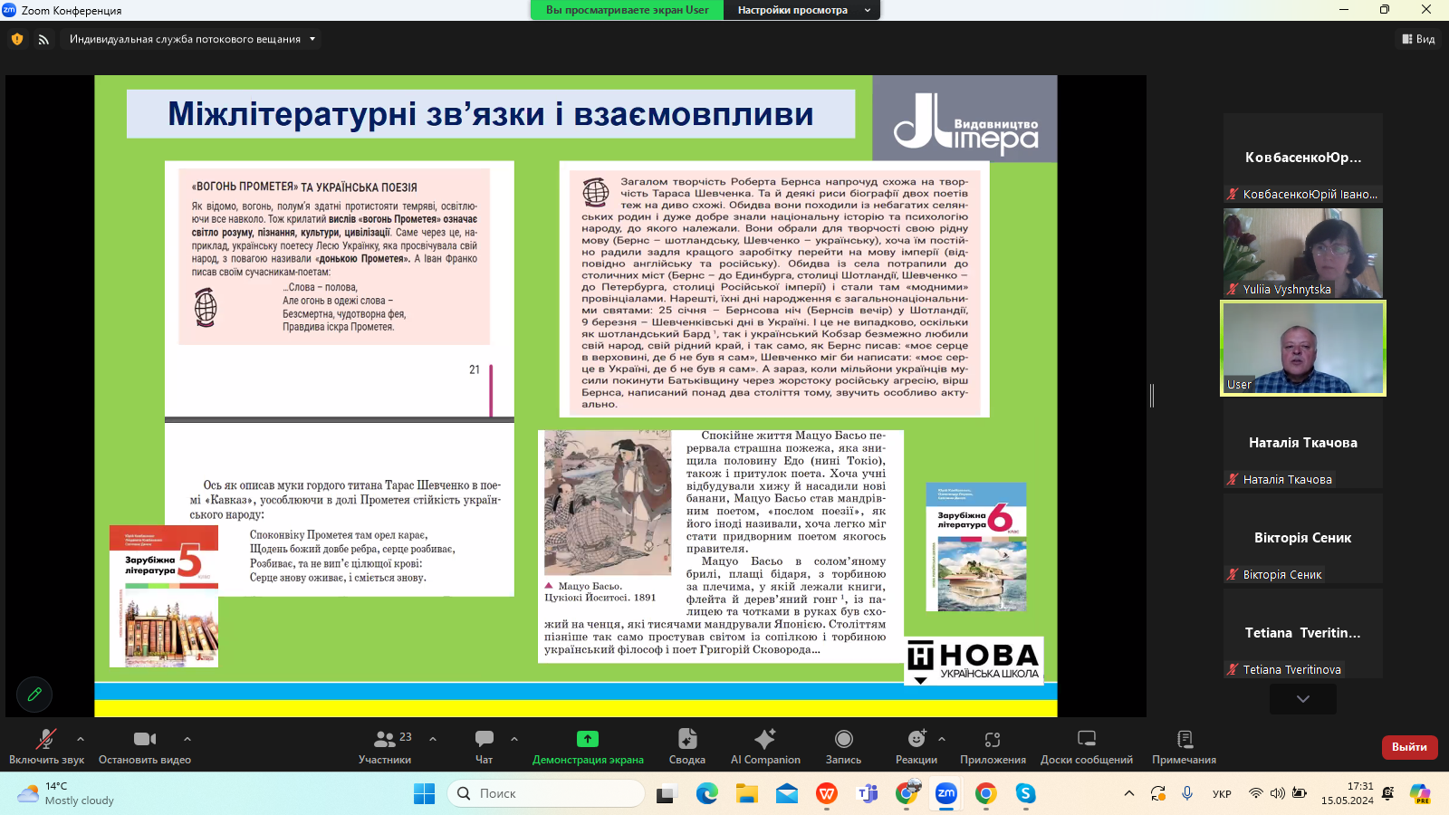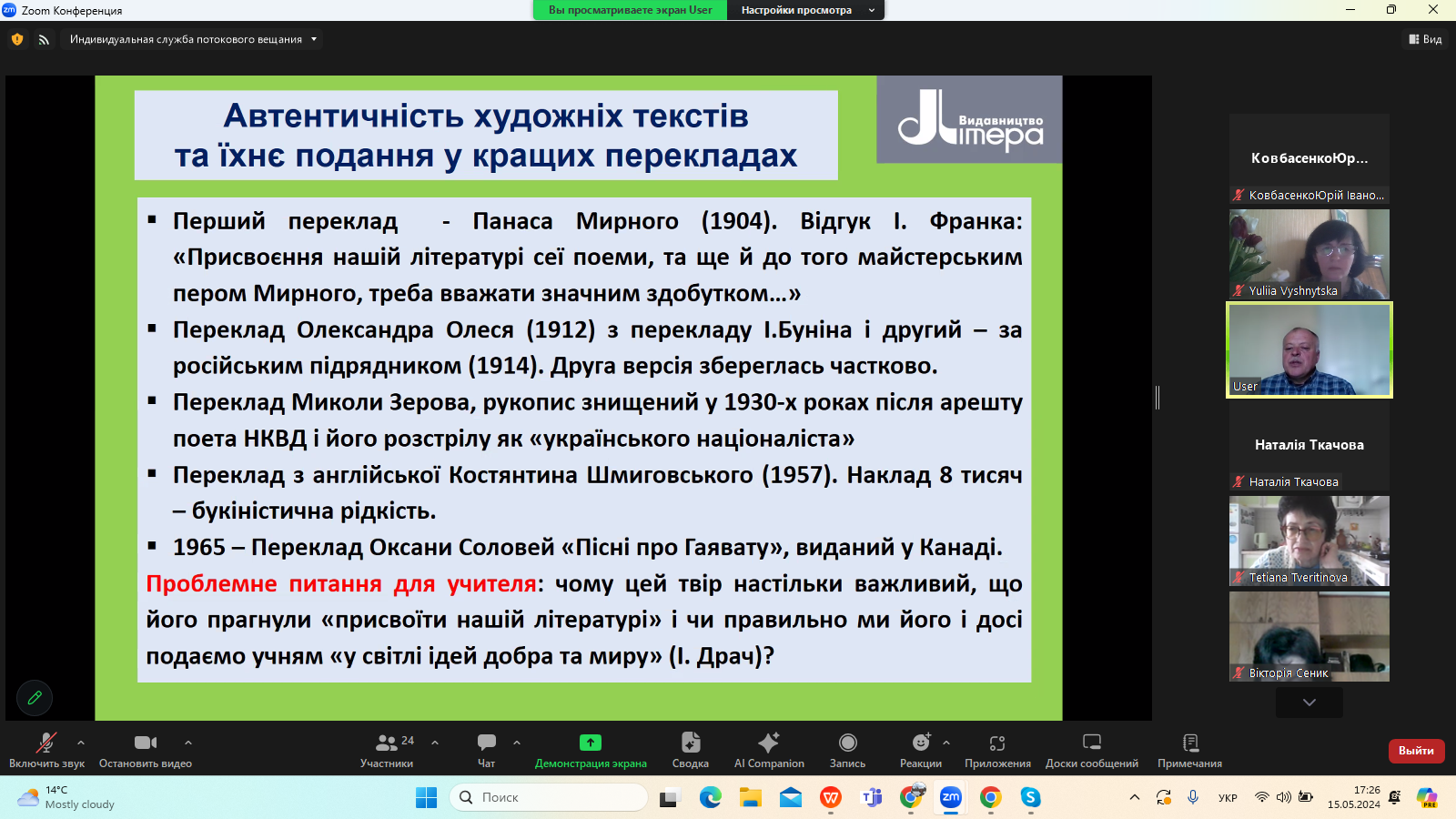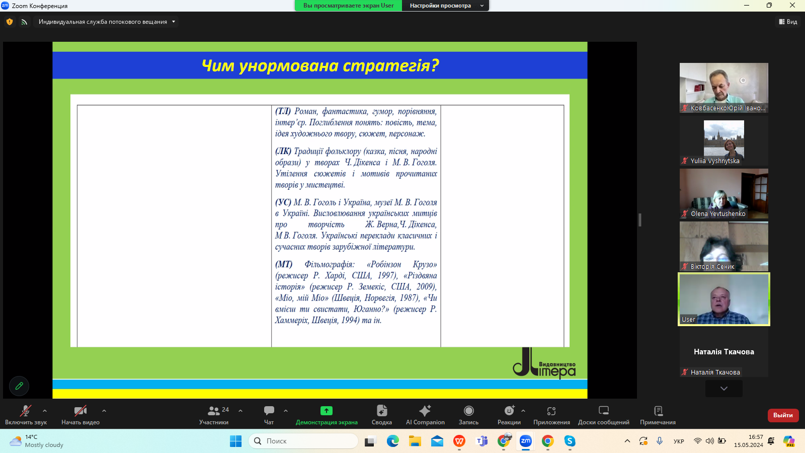 15 травня 2024 року в межах Фестивалю науки – 2024 на платформі видавництва «Літера ЛТД» відбувся Всеукраїнський вебінар «Нові стратегії літературної освіти в Україні», на якому розглянули питання постколоніального й аксіологічного виміру сучасної української гуманітаристики.