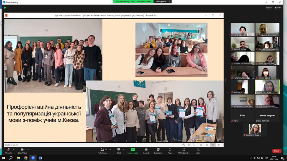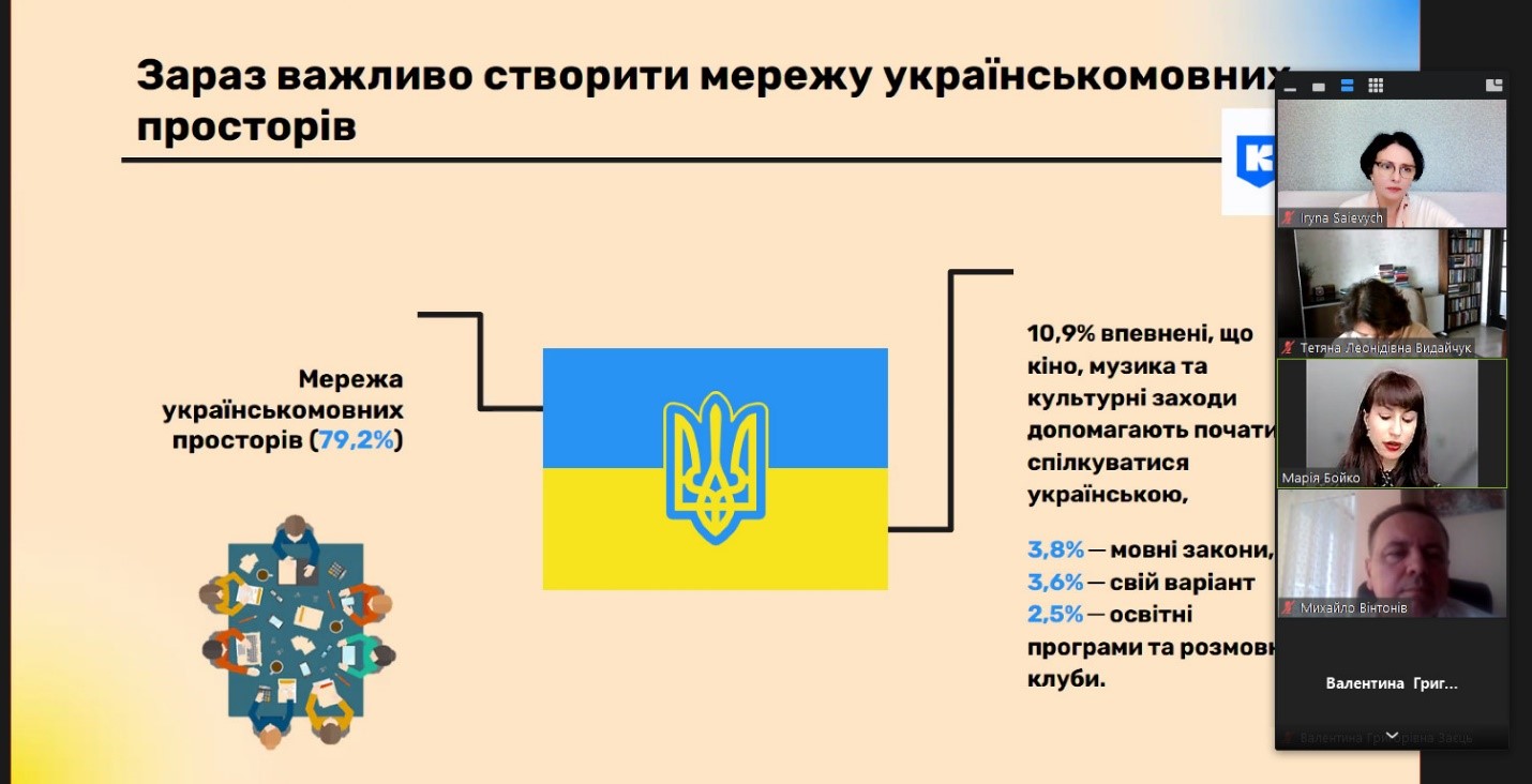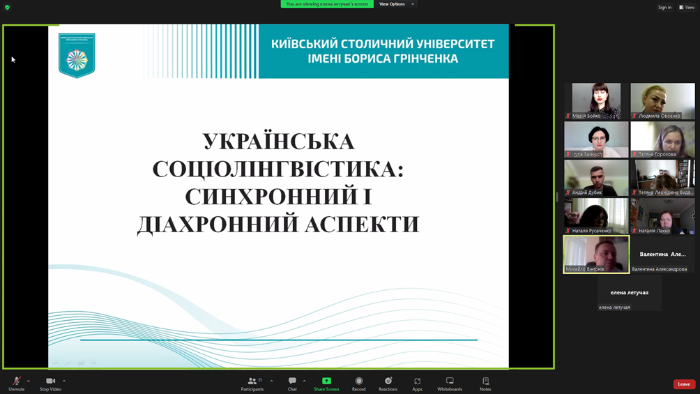 Проблему соціолінгвістичного простору м. Києва у синхронному й діахронному вимірах порушили: Тетяна Видайчук, доцент кафедри української мови Факультету української філології, культури і мистецтва Київського столичного університету імені Бориса Грінченка, кандидат філологічних наук, доцент («Мовне середовище міста Києва: концепція соціолеми»); Тетяна Горохова, доцент кафедри української мови Факультету української філології, культури і мистецтва Київського столичного університету імені Бориса Грінченка, кандидат педагогічних наук і Марія Бойко, старший викладач кафедри української мови Факультету української філології, культури і мистецтва Київського столичного університету імені Бориса Грінченка, доктор філософії у галузі філології («Мовні ініціативи міста Києва для популяризації української»); Юлія Краснікова, аспірантка І року навчання спеціальності «035 Філологія» Факультету української філології, культури і мистецтва Київського столичного університету імені Бориса Грінченка («Українська мова в ЗМК діаспори: стан і перспективи»).