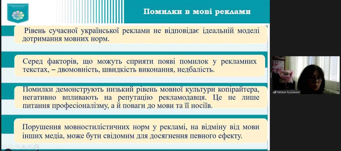 Окрім того, у виступах було порушено важливе питання мовної норми в інформаційному просторі м. Києва та в освітньому середовищі ЗВО і ЗСО: Наталя Русаченко, доцент кафедри української мови Факультету української філології, культури і мистецтва Київського столичного університету імені Бориса Грінченка, кандидат філологічних наук, доцент («Типологія мовних помилок у зовнішній рекламі міста Києва»); Раїса Дружененко, доцент кафедри української мови Факультету української філології, культури і мистецтва Київського столичного університету імені Бориса Грінченка, кандидат педагогічних наук, доцент («Проєктна діяльність студентів Факультету української філології, культури і мистецтва КСУБГ у парадигмі дослідження мовної норми столиці».