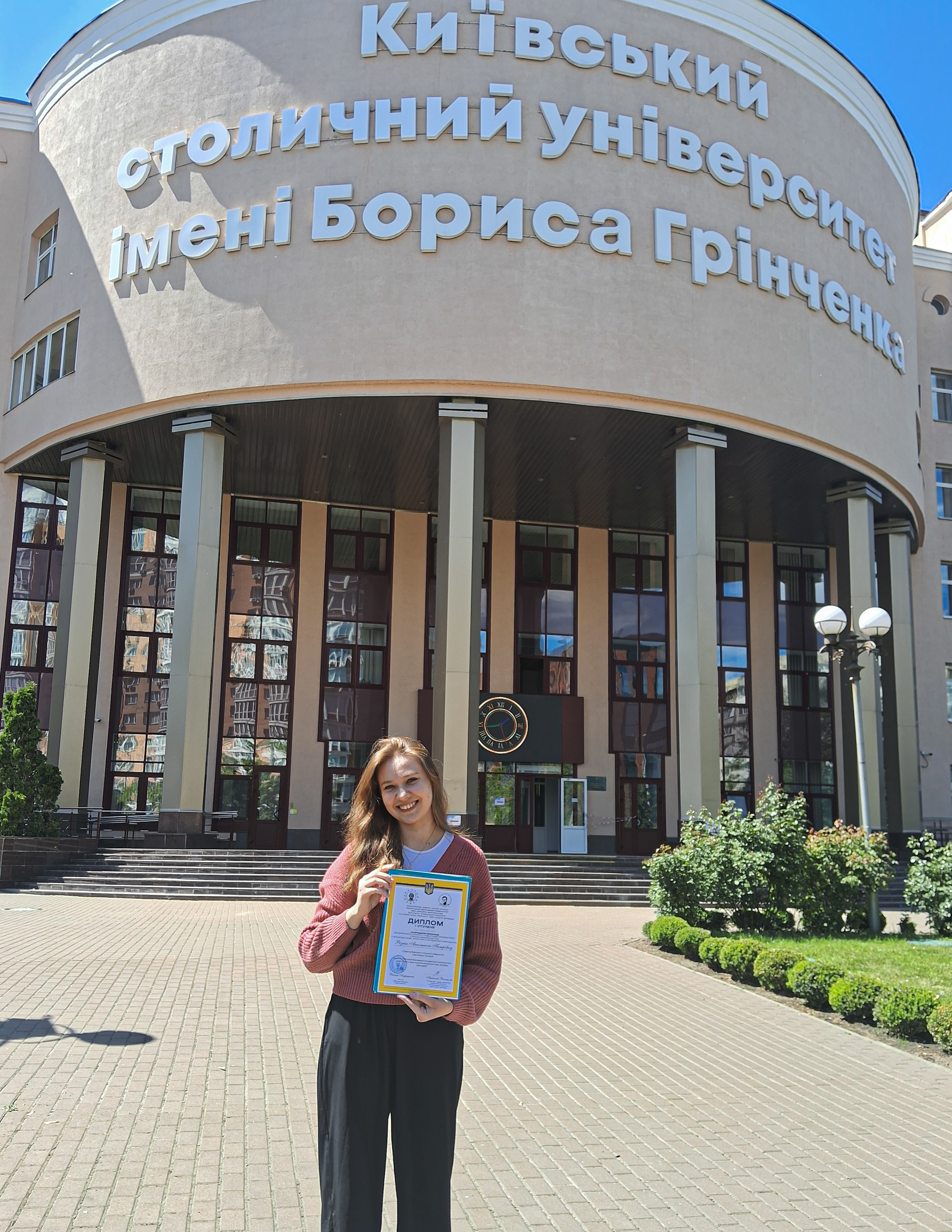Тішимося, що з-поміж переможців – здобувачка Київського столичного університету імені Бориса Грінченка. Тож вітаємо Анастасію Петрівну РЕЗНІК, студентку ІV курсу спеціальності «Українська мова та література» (УМЛб-1-20-4.0д) і її наукового керівника – Ольгу Володимирівну КАРАМАН, професора кафедри української мови Факультету української філології, культури і мистецтва, кандидата педагогічних наук, професора, із цим науковим здобутком. Анастасія Петрівна нагороджена дипломом І ступеня.