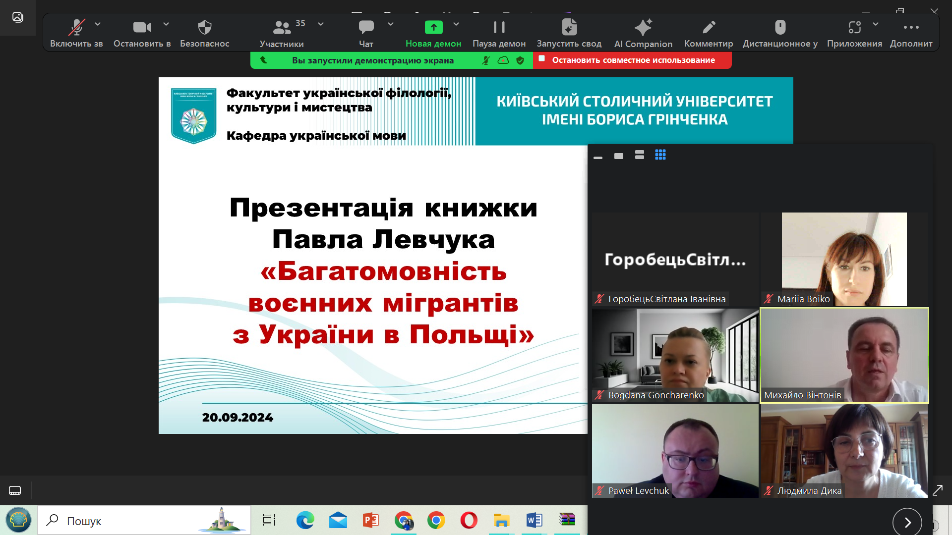 20 вересня 2024 року на Факультеті української філології, культури і мистецтва Київського столичного університету імені Бориса Грінченка відбулася онлайн-презентація книжки доктора гуманітарних наук Павела Левчука «Багатомовність воєнних мігрантів з України в Польщі». Павел Левчук представив своє дослідження багатомовності, акцентуючи увагу на викликах, з якими стикаються українські мігранти в Польщі після початку війни. Окрему увагу було приділено методології дослідження, обґрунтуванню ролі рідної мови в адаптації мігрантів та її збереження в нових умовах.