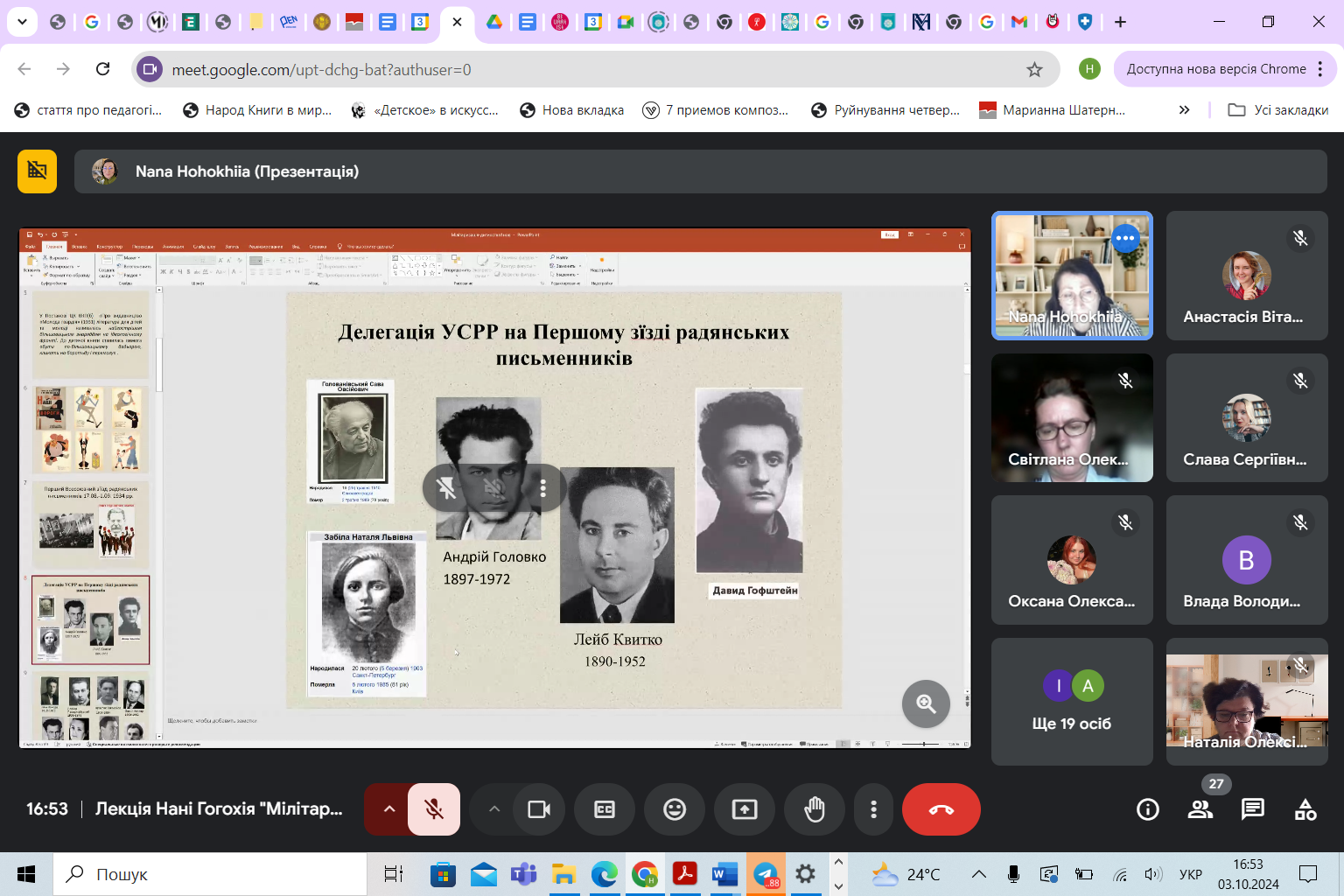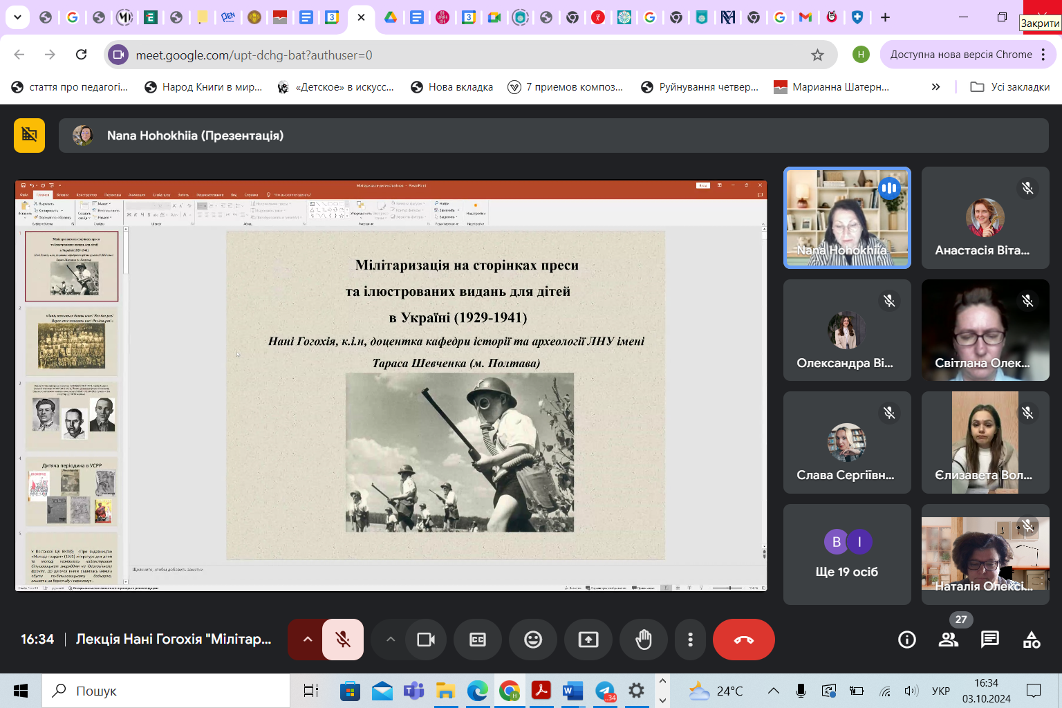 - гостьову лекцію «Мілітаризація на сторінках преси та ілюстрованих видань для дітей в Україні (1929-1941)» Нані Гогохія, кандидата історичних наук, доцента Луганського національного університету імені Тараса Шевченка (м. Полтава) (модератори – Євтушенко С.О., кандидат філологічних наук, доцент кафедри української літератури, компаративістики і грінченкознавства, Блохіна Н.О., старший викладач кафедри української літератури, компаративістики і грінченкознавства).
