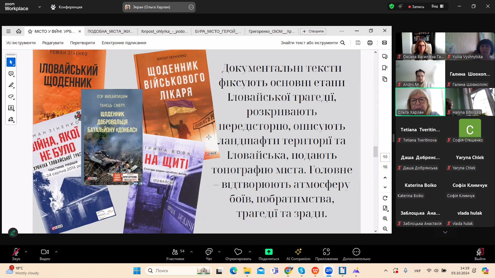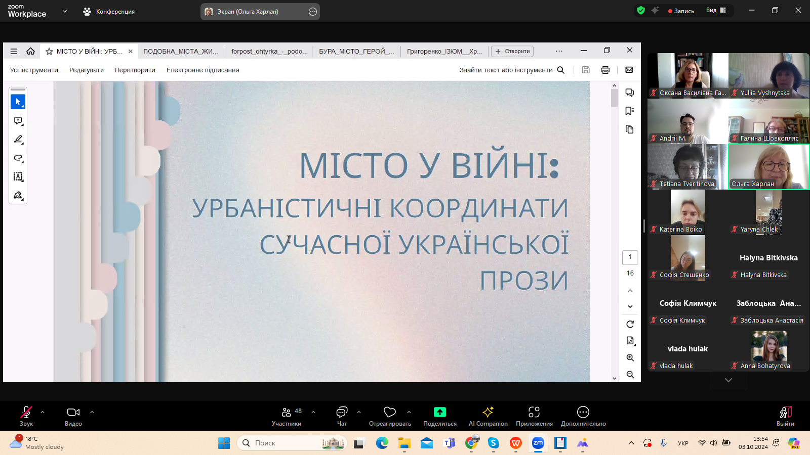 - гостьову лекцію «Місто у війні: урбаністичні координати сучасної української прози» Харлан О.Д., доктора філологічних наук, професора, завідувача кафедри української та зарубіжної літератури і порівняльного літературознавства Бердянського державного педагогічного університету (модератори – Бітківська Г. В., доктор філологічних наук, доцент, завідувач кафедри світової літератури, Гальчук О. В., доктор філологічних наук, доцент, професор кафедри світової літератури);