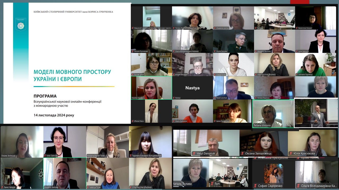 14 листопада 2024 року у Київському столичному університеті імені Бориса Грінченка відбулася наукова онлайн-конференція «Моделі мовного простору України і Європи», ініційована кафедрою української мови Факультету української філології, культури і мистецтва. Відкриваючи конференцію, завідувач кафедри української мови Михайло Вінтонів наголосив на значному представницькому складі учасників з наукових і освітніх установ України і зарубіжжя. З вітальним словом до наукового товариства звернулись проректор з наукової роботи, голова Вченої ради Університету Грінченка Наталія Віннікова і декан Факультету української філології, культури і мистецтва Ірина Руснак.