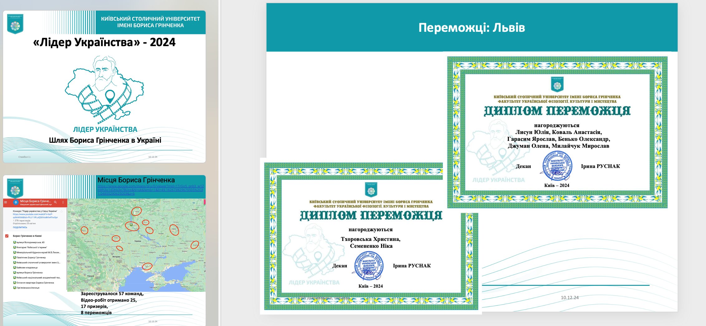 Координатор конкурсу доцент кафедри інформаційних комунікацій Ігор Стамбол презентував результати цьогорічного конкурсу та нагородив дипломами призерів учасників 17 команд. Вісім дипломів переможців конкурсу «Лідер українства» отримали такі здобувачі освіти: