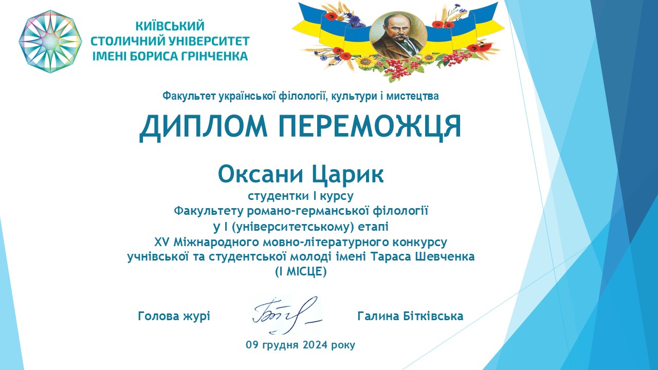 Серед студентів-філологів перемогу здобула Оксана ЦАРИК ‒ студентка І курсу Факультету романо-германської філології.