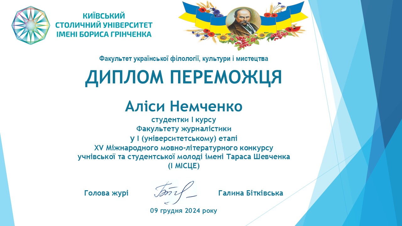 Переможницею конкурсу серед грінченківців-нефілологів стала студентка І курсу Факультету журналістики Аліса НЕМЧЕНКО.