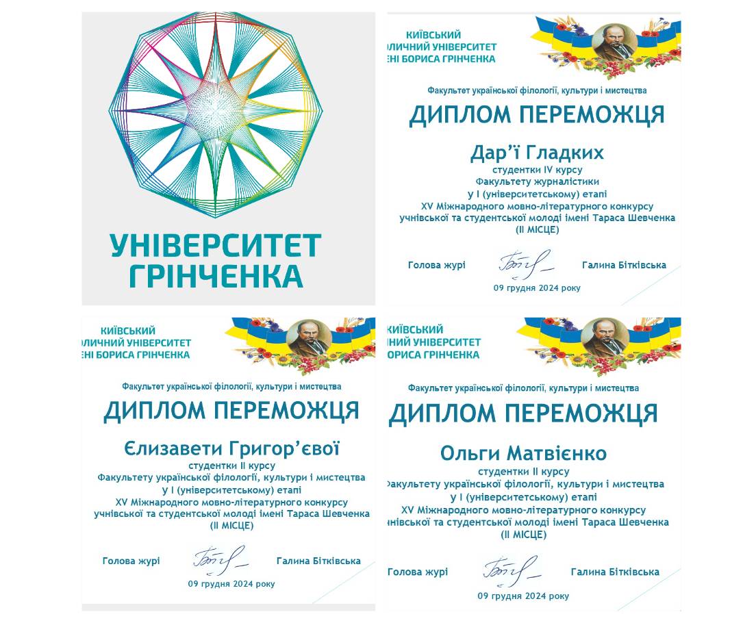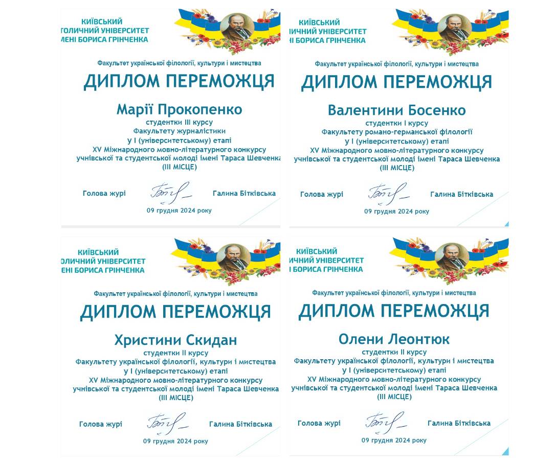 Дипломом переможця (ІІІ місце серед студентів нефілологічних спеціальностей) відзначено Марію ПРОКОПЕНКО, студентку ІІІ курсу Факультету журналістики.