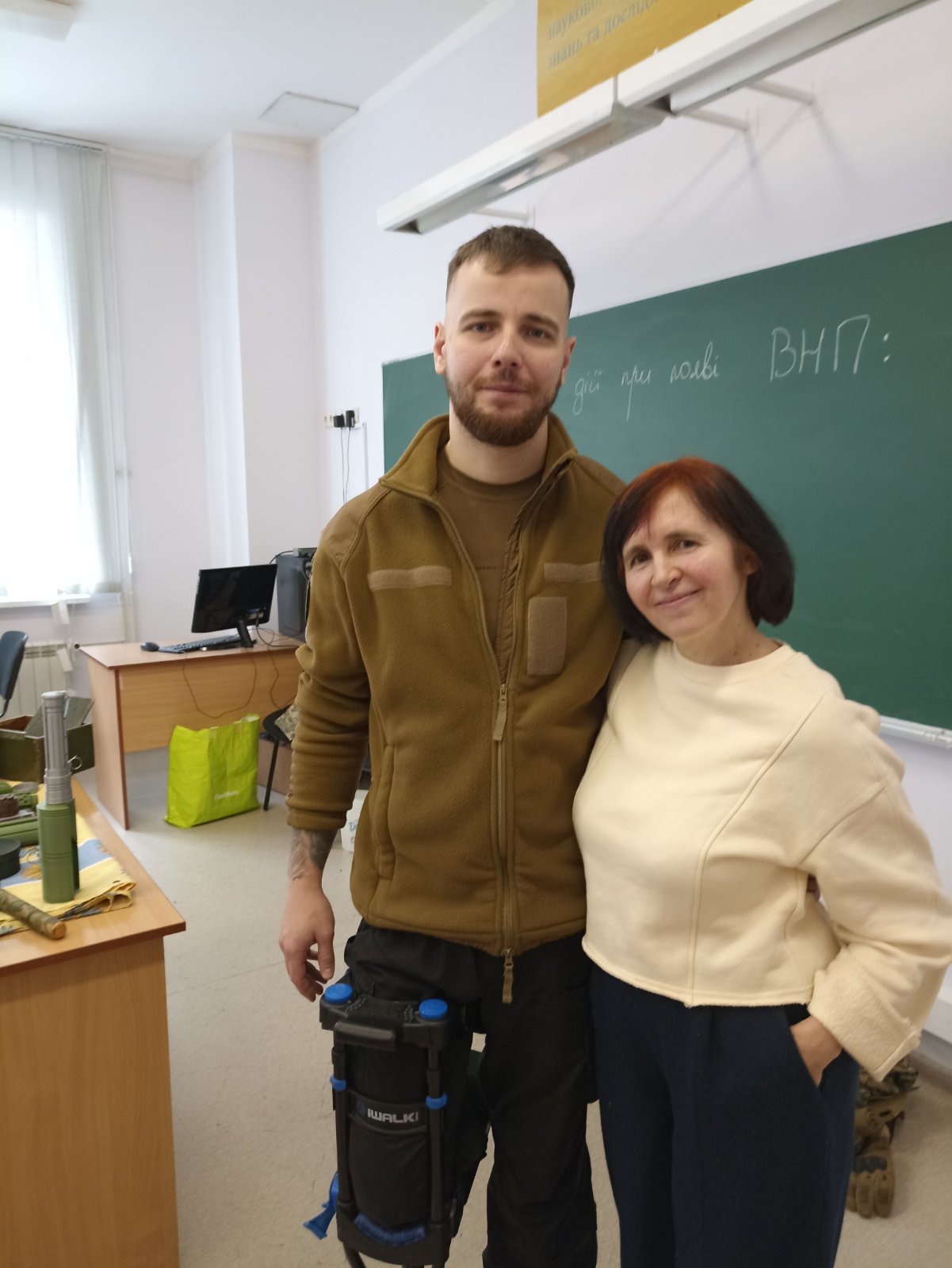 До заходу долучився випускник Університет Грінченка, учасник бойових дій Сергій Назаренко, який поділився досвідом участі в бойових діях, розповів про реальні ситуації, пов’язані з мінною небезпекою, з якими довелося зіткнутися на фронті, наголосив на важливості дотримання правил безпеки та обачності під час виявлення підозрілих предметів.