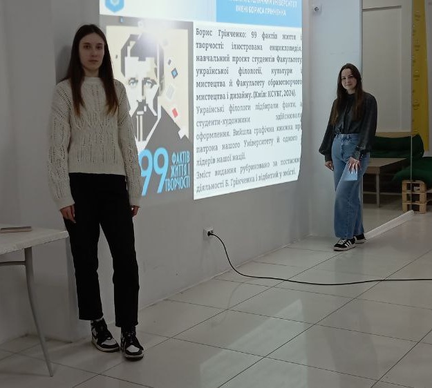 Перше заняття розпочали зі знайомства з ідейним лідером Університету за унікальним виданням «Борис Грінченко: 99 фактів життя і творчості: ілюстрована енциклопедія», створеним студентами Факультету української філології, культури і мистецтва та Факультету образотворчого мистецтва і дизайну.