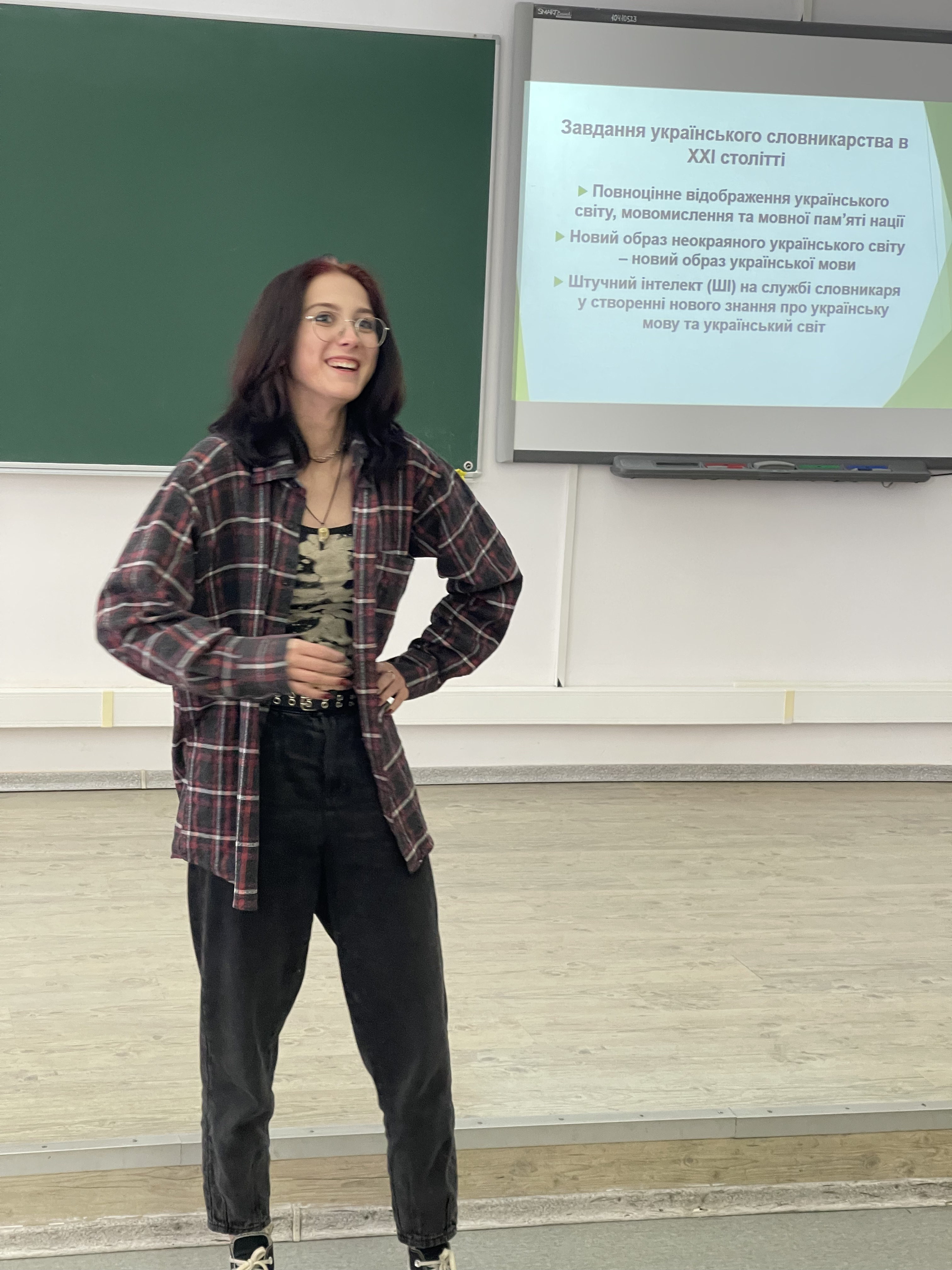 Зустріч продовжила О. М. Тищенко, яка поділилася з присутніми думками про взаємодію зі студентами під час проходження практики й повідомила про унікальні результати їхньої наполегливої праці – близько 11 000 цитат, дібраних до реєстрових одиниць «Активного словника української мови» в 4-х тт., над яким працюють науковці відділу. Оксана Миколаївна підтвердила зацікавлення у зміцненні контактів з Факультетом української філології, культури і мистецтва і наголосила на цінності і важливості доробку студентів для лексикографів.