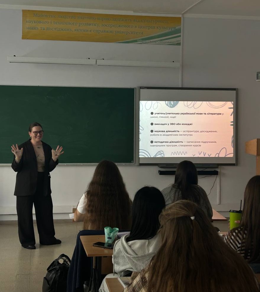 8 вересня 2025 р. на Факультеті української філології, культури і мистецтва Університету Грінченка відбулася зустріч студентів першого курсу освітньої програми «Українська мова та література» із запрошеною спікеркою – Анастасією Бречко, освітянкою та засновницею онлайн-школи української мови «НевгаМОВНО», нашою випускницею. Під час виступу пані Анастасія поділилася власним професійним досвідом і розповіла про різні можливості самореалізації в освітній сфері. Вона акцентувала увагу на тому, що майбутні бакалаври можуть обирати найрізноманітніші ролі: від викладання й розробки освітніх курсів до участі у створенні сучасних навчальних продуктів та культурно-освітніх проєктів.