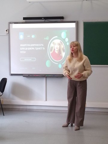 22 жовтня 2025 року, з нагоди Міжнародного дня академічної доброчесності, завідувач кафедри інформаційних комунікацій Олена Політова провела зустріч зі студентами першого курсу освітньо-професійної програми «Ведучий телевізійних програм». Розмова була присвячена темі: «Академічна доброчесність: шлях до довіри, гідності та успіху».