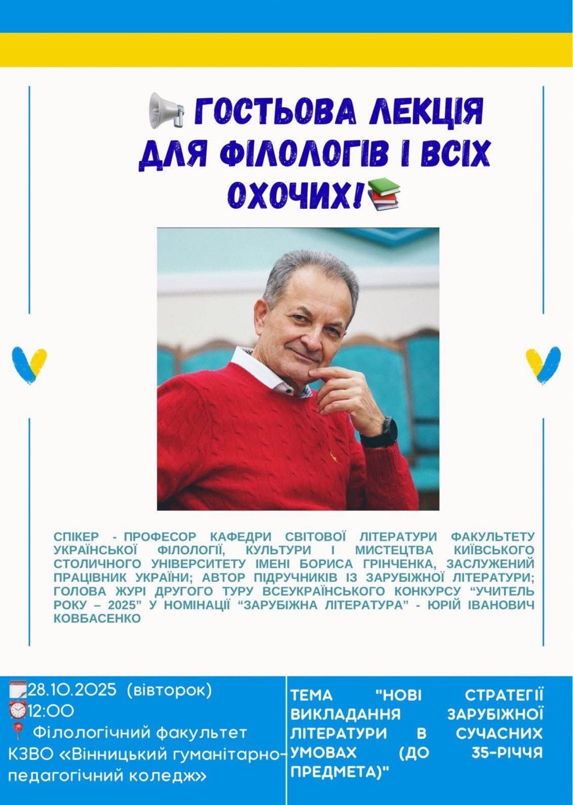 28 жовтня 2025 р. професор кафедри світової літератури Факультету української філології, культури i мистецтва Київського столичного університету імені Бориса Грінченка Юрій Іванович КОВБАСЕНКО прочитав гостьову лекцію «Нові стратегії викладання зарубіжної літератури в сучасних умовах (до 35-річчя предмета)» на філологічному факультеті КЗВО «Вінницький гуманітарно-педагогічний коледж».