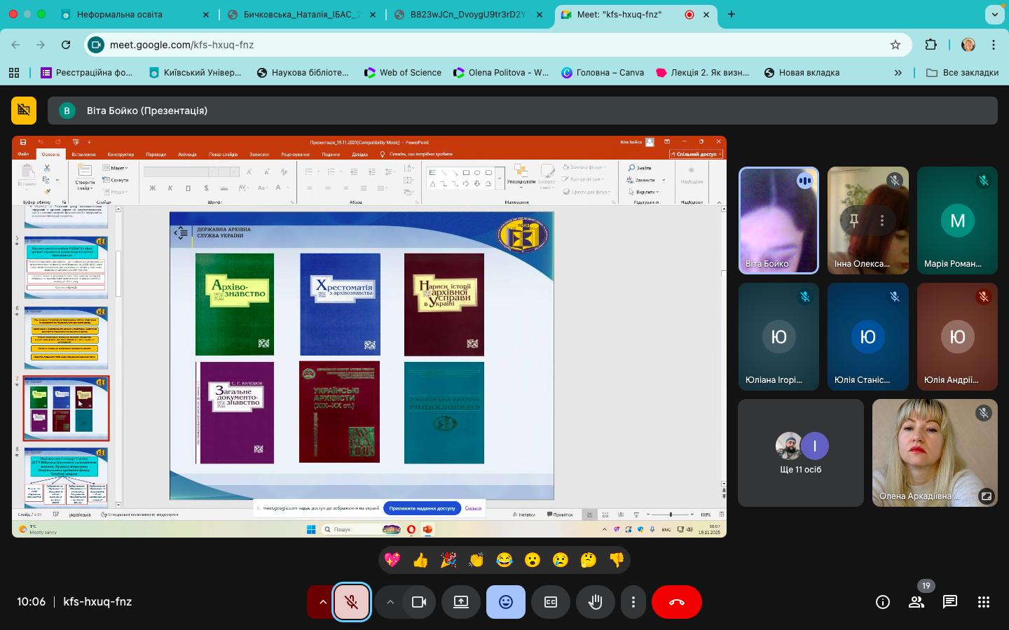 Окрім студентів 2 курсу, які разом з професором кафедри І. О. Демуз цьогоріч опановують навчальну дисципліну «Архівознавство», до лекції доєдналися студенти 3 курсу бакалаврату та 1 курсу магістратури ОП «Інформаційна, бібліотечна та архівна справа» зі своїми викладачами ‒ О.А. Політовою, завідувачем кафедри, й О. В. Григоревською, професором кафедри.