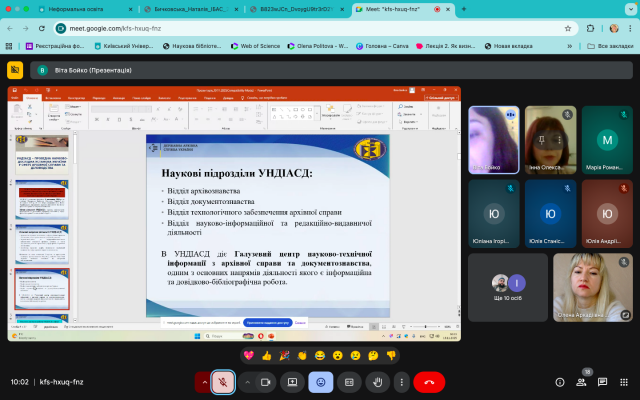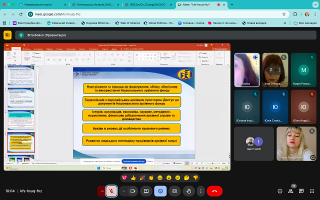 Лектор презентувала низку актуальних для архівної галузі теоретико-практичних аспектів, над вирішенням яких працює УНДІАСД, висвітлила основні напрями діяльності установи, зосередила увагу на розробленні важливих для України національних стандартів та методичних рекомендацій, що регулюють аспекти зберігання, публікації архівних документів, термінологічного забезпечення галузі, на збереженні електронних та цифрових аудіовізуальних документів, на упровадженні електронних послуг в архівних установах України, на роботі архівних установ в умовах особливих правових режимів. Виняткову зацікавленість і додаткові запитання у викладацько-студентської аудиторії викликала ініціатива УНДІАСД щодо регламентації процесів документування подій широкомасштабної збройної агресії РФ проти України. Прозвучали запитання про міжнародну співпрацю УНДІАСД, про доступність для студентської аудиторії навчально-методичних архівознавчих комплексів, розроблених співробітниками установи тощо.