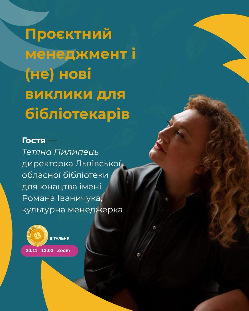 Тема зустрічі ‒ «Проєктний менеджмент і (не) нові виклики для бібліотекарів»; спікер ‒ відома представниця сучасної бібліотечної сфери ‒ Таня Пилипець, директор Львівської обласної бібліотеки для юнацтва ім. Романа Іваничука, досвідчена модератор культурних подій, лектор, бібліотечний тренер та заслужений працівник культури України.