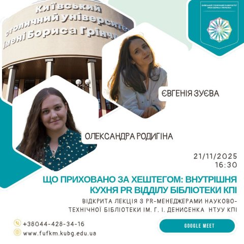 Чи замислювалися ви, як найбільші бібліотеки України створюють ефективний контент у соцмережах і формують свій імідж? 21 листопада на гостьовій лекції студенти спеціальності «Інформаційна, бібліотечна та архівна справа» і PR-менеджери Науково-технічної бібліотеки ім. Г. І. Денисенка  Олександра Родигіна та Євгенія Зуєва шукали відповідь на це запитання.