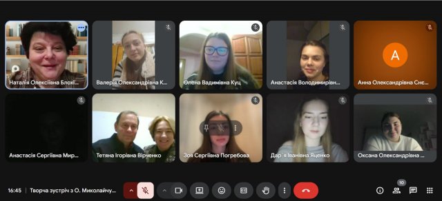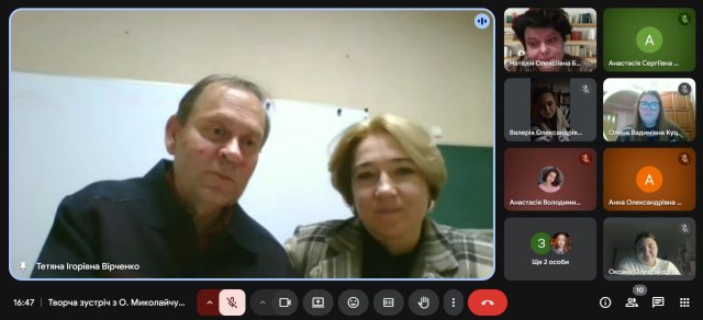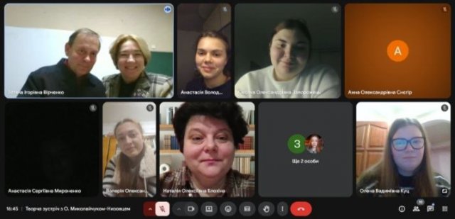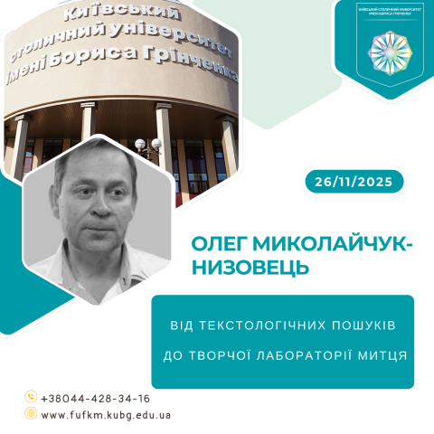26 листопада на запрошення кафедри української літератури, компаративістики і грінченкознавства для студентів ОП «Українська мова і література» першого (бакалаврського) рівня вищої освіти і ОП «Біографістика і текстологія» другого (магістерського) рівня вищої освіти відбулася творча зустріч із драматургом, журналістом, кіносценаристом, науковим співробітником Національного центру театрального мистецтва ім. Леся Курбаса Олегом Миколайчуком-Низовцем (модератор зустрічі – старший викладач Наталія Блохіна, координатор події – професор Тетяна Вірченко). У фокусі розмови була п’єса «Зніміть з небес офіціанта, або Навіщо нам позаторішній сніг» у двох редакціях, що дало змогу простежити еволюцію авторського задуму, жанрові модифікації («майже моновистава», «драма на одну дію з феєричними варіаціями»), символіку назви та особливості діалогізму й образної системи твору.