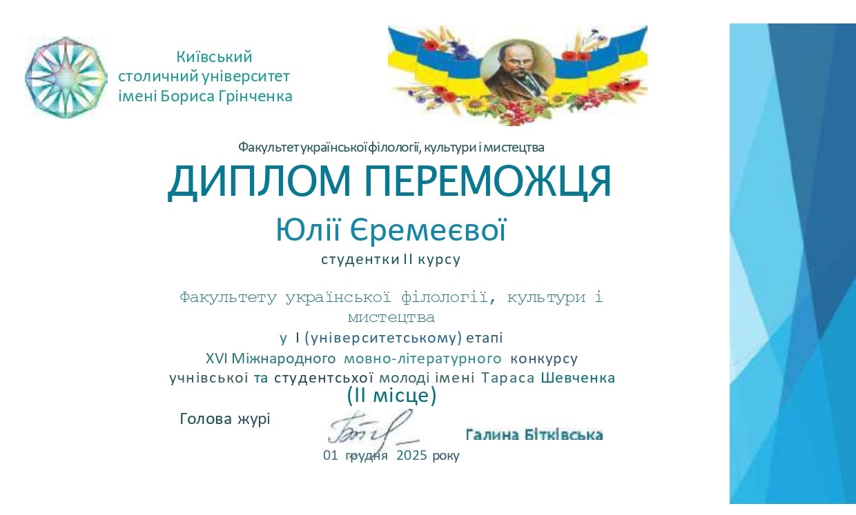 Єремеєва Юлія Віталіївна, студентка 2 курсу бакалаврського рівня вищої освіти ОП «Українська мова та література» Факультету української філології, культури і мистецтва ‒ ІІ місце;