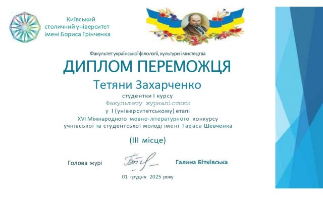 Захарченко Тетяна Вікторівна, студентка 1 курсу бакалаврського рівня вищої освіти ОП «Видавнича справа та редагування» Факультету журналістики ‒- ІІІ місце.