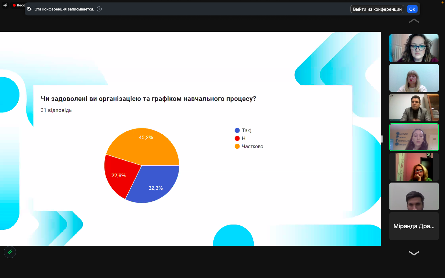 Алла Мажара, старший викладач кафедри інформаційних комунікацій, та Інна Шкляренко, студентка ІІІ курсу, представили результати свого дослідження про обговорення освітнього процесу на ОПП «Ведучий телевізійних програм» в Університеті Грінченка. Алла Вікторівна також поділилися своїми інсайтами щодо глибинного інтерв’ю як методу, який використовує усна історія. Питань історії стосувався виступ Ігоря Стамбола, доцента кафедри інформаційних комунікацій, та Тетяни Колосової, керівника Українського кризового медіацентру, які презентували відеопроєкт «Міфи та наративи російської пропаганди, які руйнують українську ідентичність на півдні та сході України: викриття та спростування».