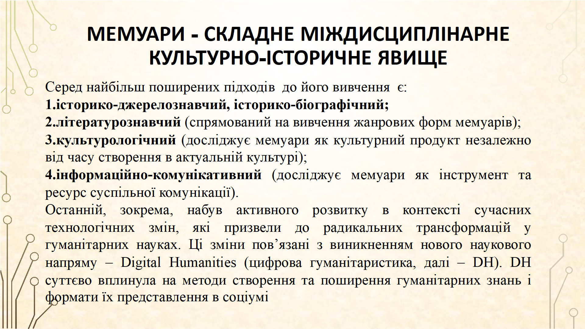 Науковий погляд на мемуари як біографічне джерело та одночасно засіб комунікативного впливу, який презентувала відома українська дослідниця, зацікавив магістрантів та науково-педагогічних працівників кафедри інформаційних комунікацій. В обговоренні особливостей розвитку мемуаристики як дослідницького напряму брали участь завідувач кафедри інформаційних комунікацій, кандидат історичних наук Олена Політова, доцент кафедри, кандидат історичних наук Ігор Стамбол, здобувачі Катерина Однолько та Єлизавета Лейєр. Професор кафедри, доктор наук із соціальних комунікацій Олена Григоревська відзначила масштабність дослідницької та видавничої діяльності інституту, яку грунтовно висвітлила у виступі Надія Іванівна.
