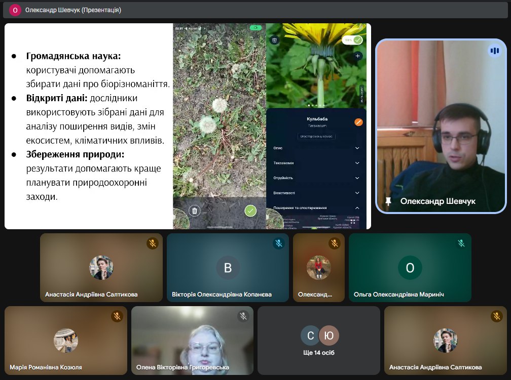Під час лекції Олександр Шевчук розповів про роль відкритої науки в інформаційній діяльності, принципи відкритої науки та її значення для суспільства на прикладах реальних проєктів, зокрема UNTWIST та Flora Incognita. Також лектор розказав про управління дослідницькими даними, принципи FAIR та детально описав роботу з метаданими, продемонструвавши реальні приклади з власної професійної діяльності.