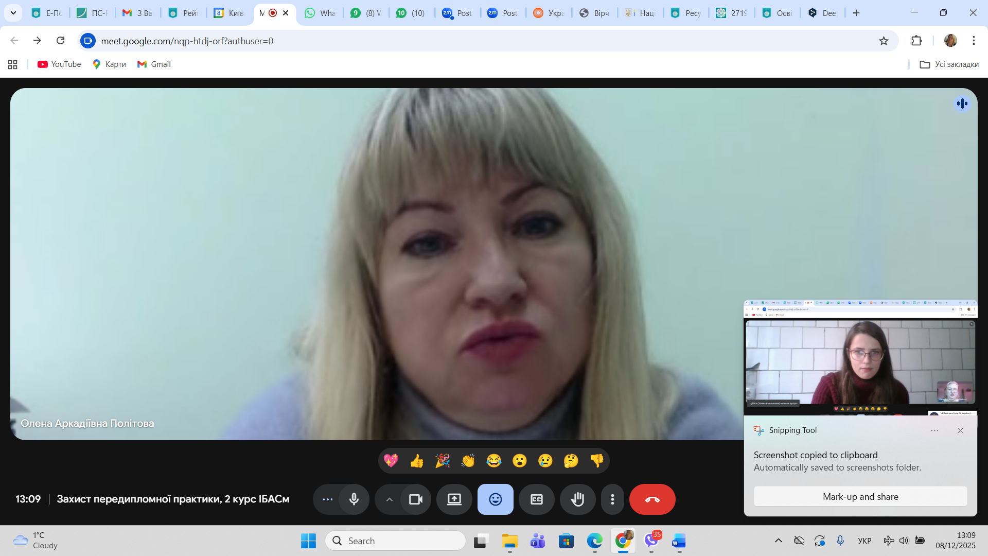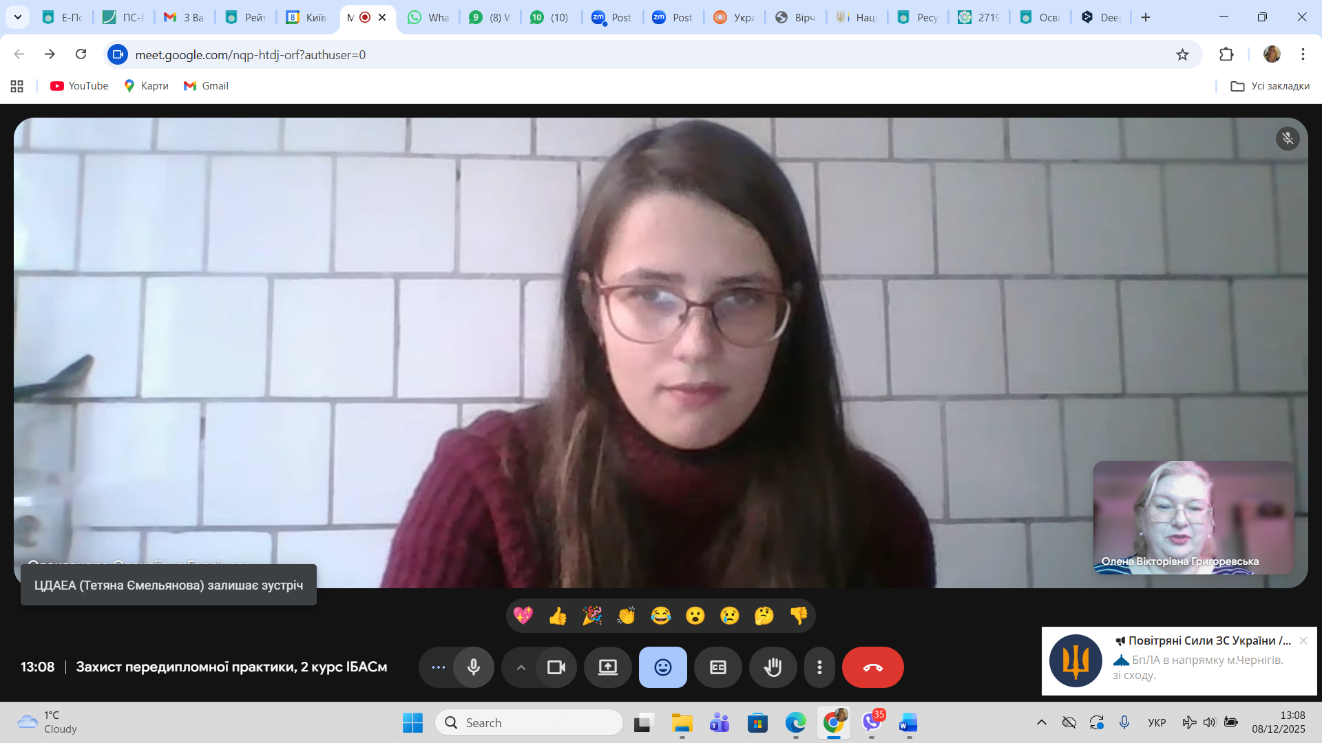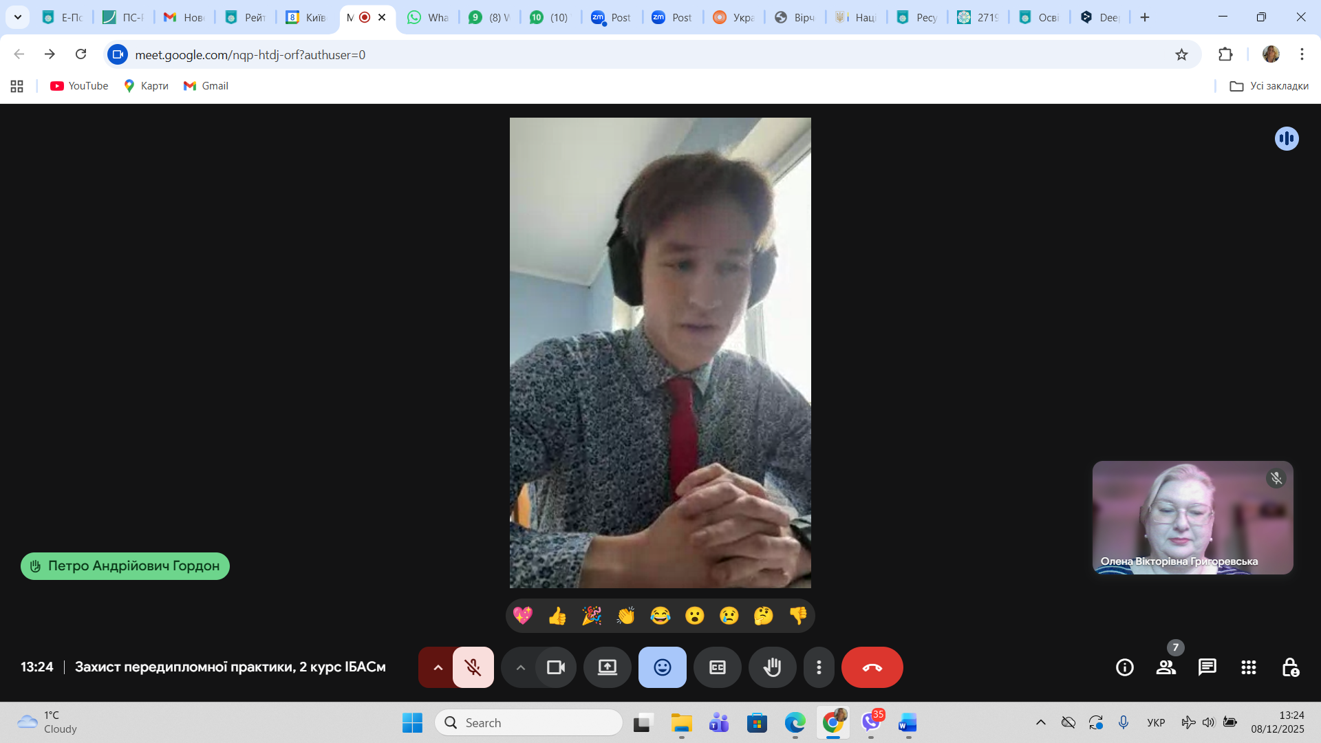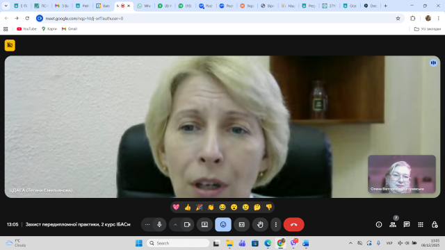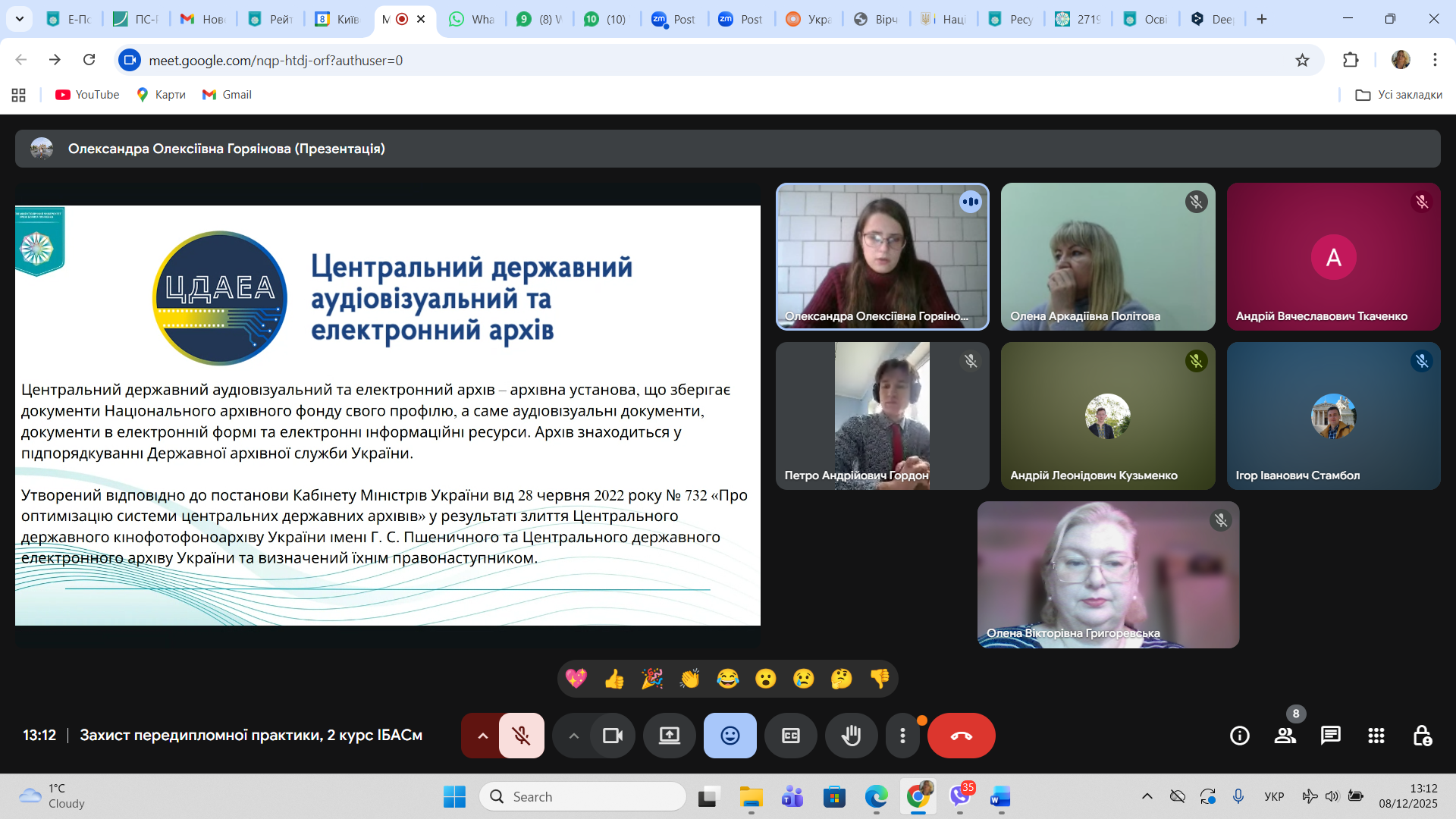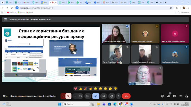8 грудня 2025 року відбулася онлайн зустріч здобувачів другого (магістерського) рівня освіти спеціальності 029 Інформаційна, бібліотечна та архівна справа Факультету української філології, культури і мистецтва із науковими керівниками кваліфікаційних робіт здобувачів та одночасно керівниками переддипломної практики – завідувачкою кафедри інформаційних комунікацій, кандидаткою історичних наук Оленою Політовою, професором кафедри, докткою наук із соціальних комунікацій Оленою Григоревською, доцентом кафедри, кандидатом історичних наук Ігорем Стамболом та представницею стейкхолдерів спеціальності – заступницею директора Центрального державного аудіовізуального та електронного архіву, кандидаткою історичних наук Оленою Косенко. Приводом для такої зустрічі стало обговорення підсумків переддипломної практики, яку з 10 листопада по 7 грудня 2025 р. здобувачі групи ІБАСм-1-24 1.4д – Олександра Горяінова, Петро Гордон, Андрій Кузьменко та Андрій Ткаченко проходили на базі ЦДАЕА.