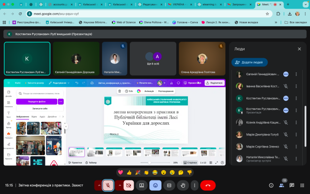 28 березня 2025 р. відбулося обговорення підсумків виробничої (технологічної) практики, яку з 10 по 19 березня 2025 р. проходили здобувачі 4 курсу першого (бакалаврського) рівня вищої освіти денної форми навчання спеціальності 029 Інформаційна, бібліотечна та архівна справа Факультету української філології, культури і мистецтва. Практика відбувалася з урахуванням дистанційного формату на базі Публічної бібліотеки імені Лесі Українки для дорослих м. Києва. Керівники практики: від Університету Грінченка – професор кафедри інформаційних комунікацій Григоревська О.В. і доцент кафедри інформаційних комунікацій Малюк Є.О., від бібліотеки – завідувачка науково-методичного відділу Іванова І.М..