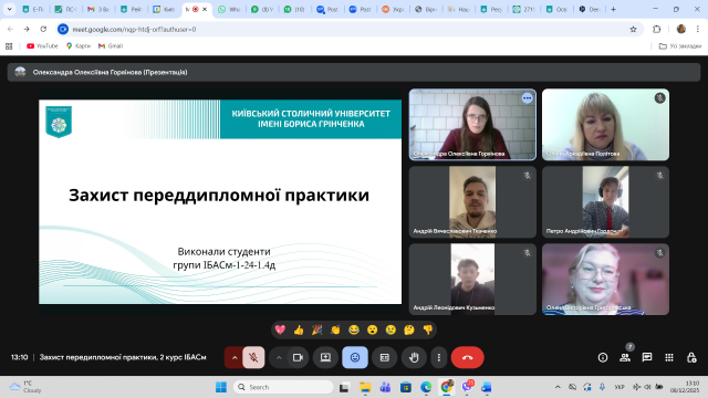 18 квітня 2025 р. відбулося обговорення підсумків виробничої практики, яку з 24 березня по 13 квітня 2025 р. проходили здобувачі І курсу другого (магістерського) рівня вищої освіти денної форми навчання спеціальності 029 Інформаційна, бібліотечна та архівна справа Факультету української філології, культури і мистецтва. Практика відбувалася з урахуванням дистанційного формату на базі Державної науково-педагогічної бібліотеки України ім. В. О. Сухомлинського. Керівники практики: від Університету Грінченка – професор кафедри інформаційних комунікацій Григоревська О.В., від бібліотеки – заступник директора з наукової роботи Пономаренко Л.О..