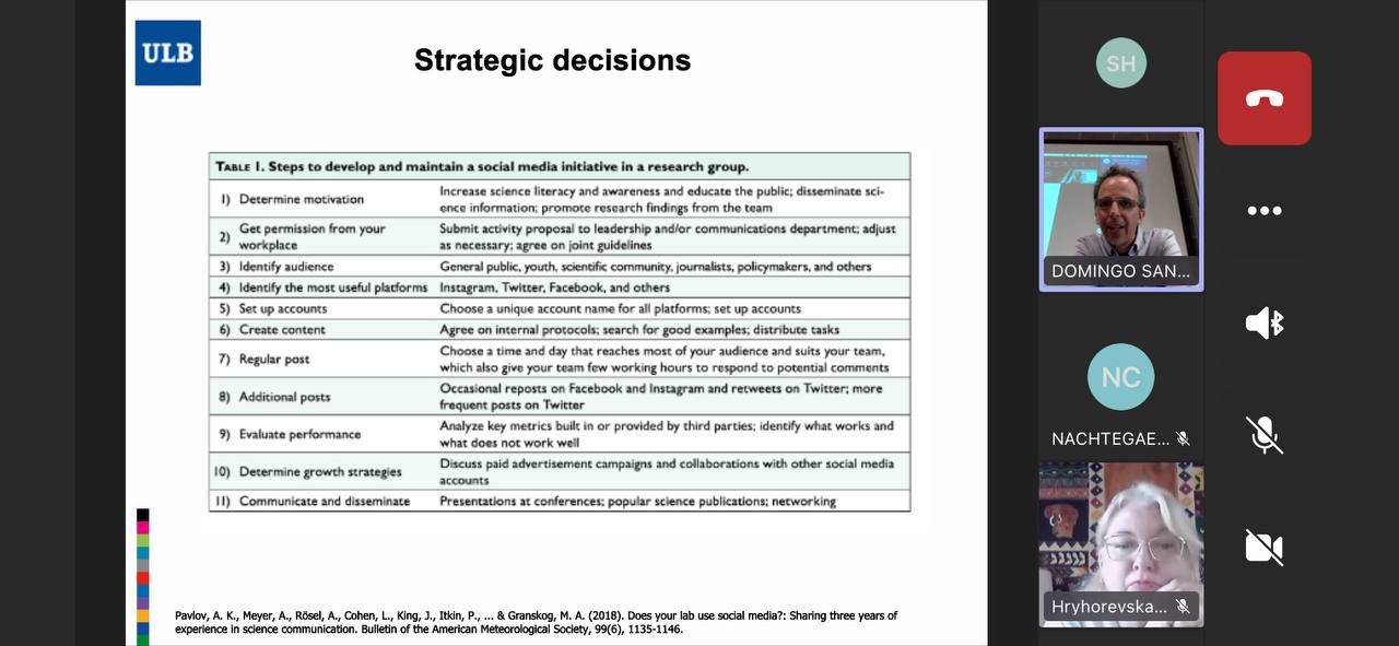 1 червня 2022 р. студенти групи ІБАм-1-21-1.4д разом із завідувачем кафедри бібліотекознавства та інформології Оленою Григоревською та старшим викладачем Євгеном Малюком долучилися до ворк-шопу із соціальних медіа у наукових комунікаціях на тему «Managing your social media presence as a researcher» (Керування своєю діяльністю дослідника у соціальних мережах), що проходив в онлайн форматі на базі Брюссельського вільного університету (Université Libre de Bruxelles).