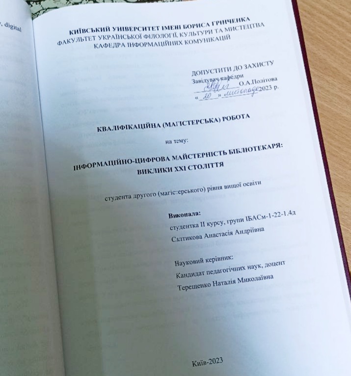 18 грудня 2023 року на кафедрі інформаційних комунікацій Факультету української філології, культури і мистецтва Київського університету імені Бориса Грінченка відбулися захисти кваліфікаційних (магістерських) робіт студентів спеціальності 029 «Інформаційна, бібліотечна та архівна справа».