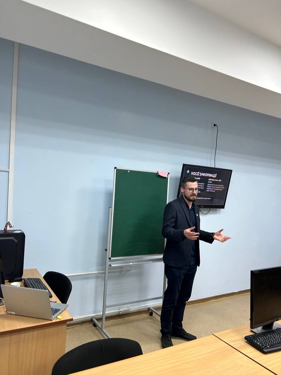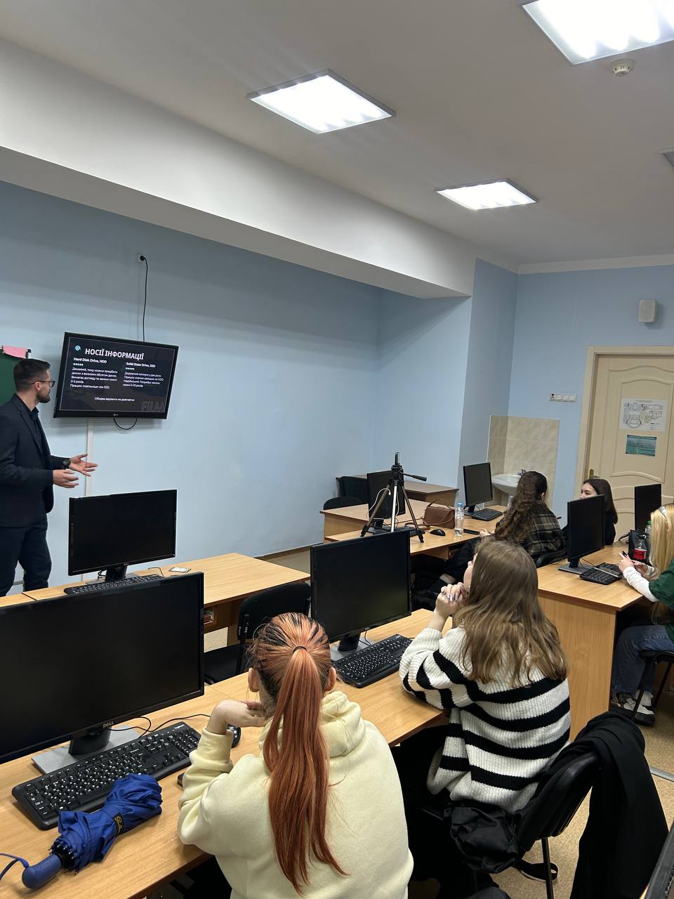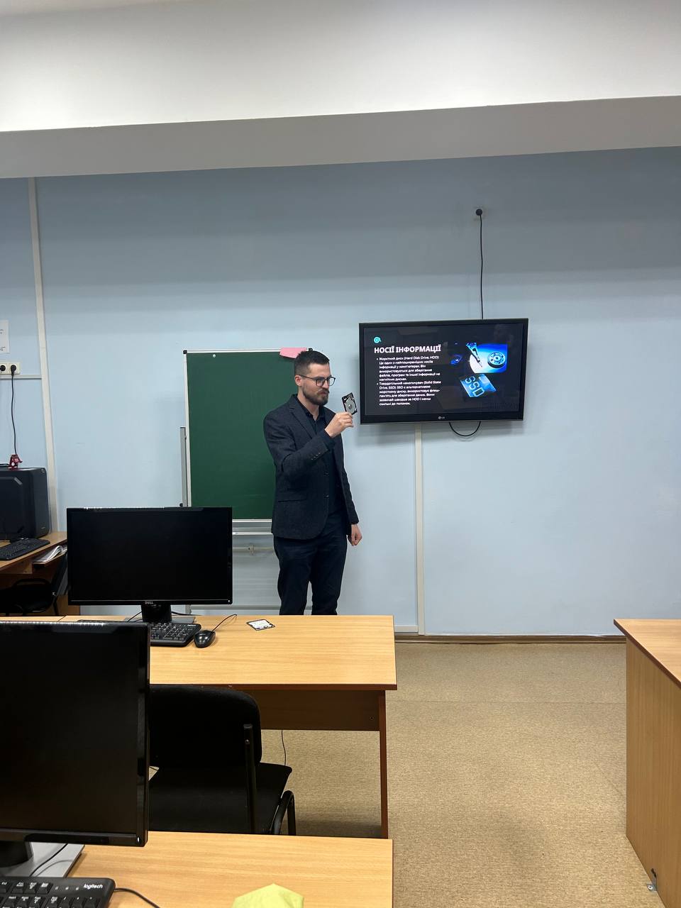 Під час лекції викладач розкрив основні поняття теми «носій інформації» «цифровий відеозапис», «формати цифрових відеофайлів», розглянув відмінності між носіями та описав їх основні характеристики. Лектор продемонстрував аудиторії різні види носіїв інформації, чим викликав жвавий інтерес студентів.