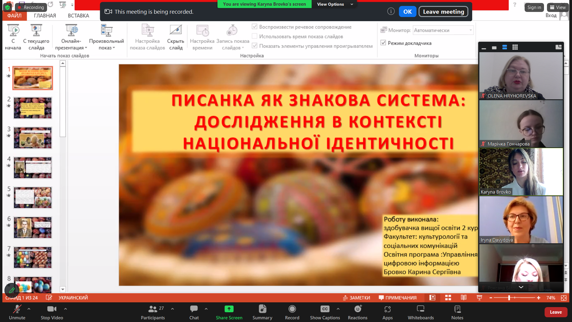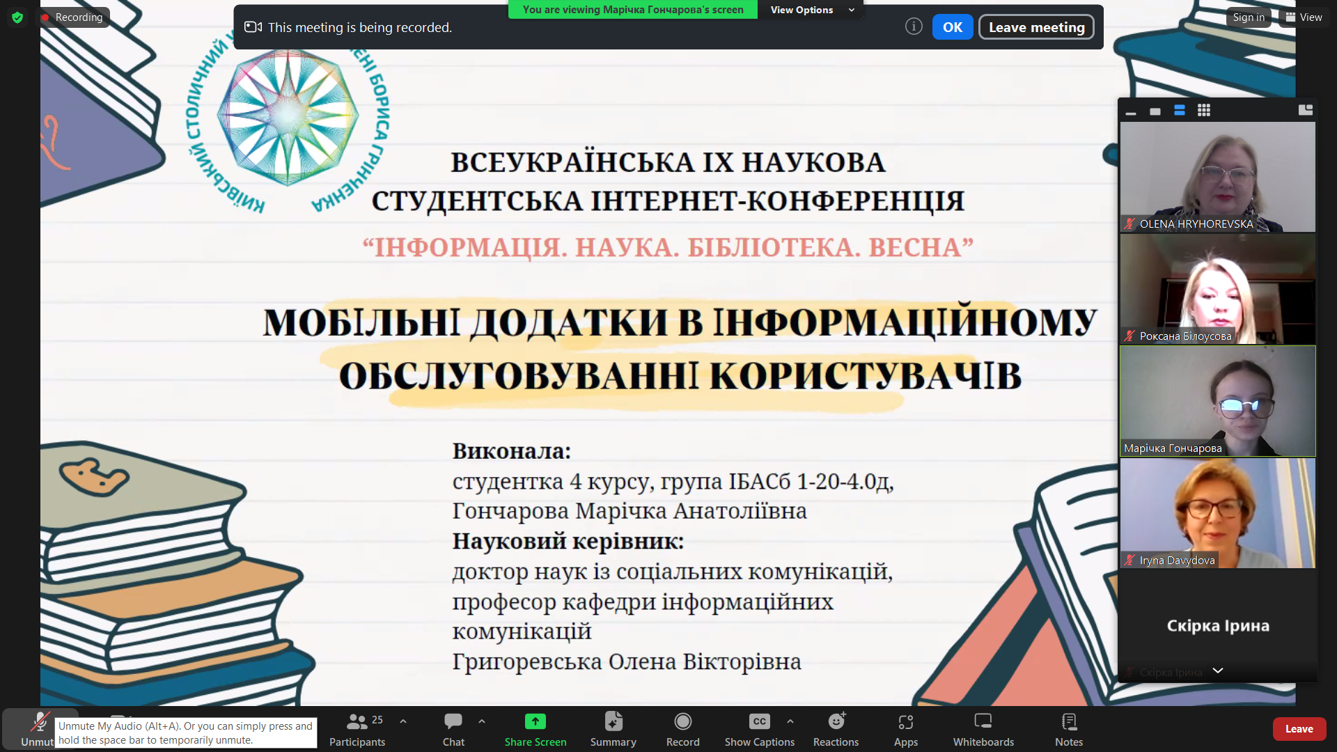 Цьогоріч наукова студентська інтернет-конференція об’єднала молодих дослідників з трьох закладів вищої освіти України – Львівського національного університету імені Івана Франка, Харківської державної академії культури, Київського столичного університету імені Бориса Грінченка. Із вітаннями з нагоди зустрічі до присутніх звернулися члени оргкомітету конференції – Роман Крохмальний (Львів), Ірина Давидова (Харків), Олена Григоревська (Київ), Олена Мар’їна (Харків). Модерувала захід завідувачка кафедри бібліотекознавства і бібліографії Львівського національного університету імені Івана Франка Роксана Білоусова.