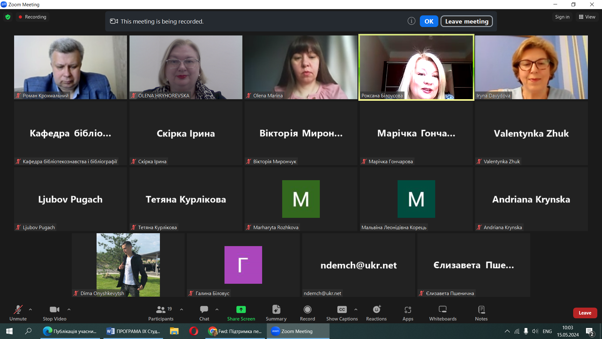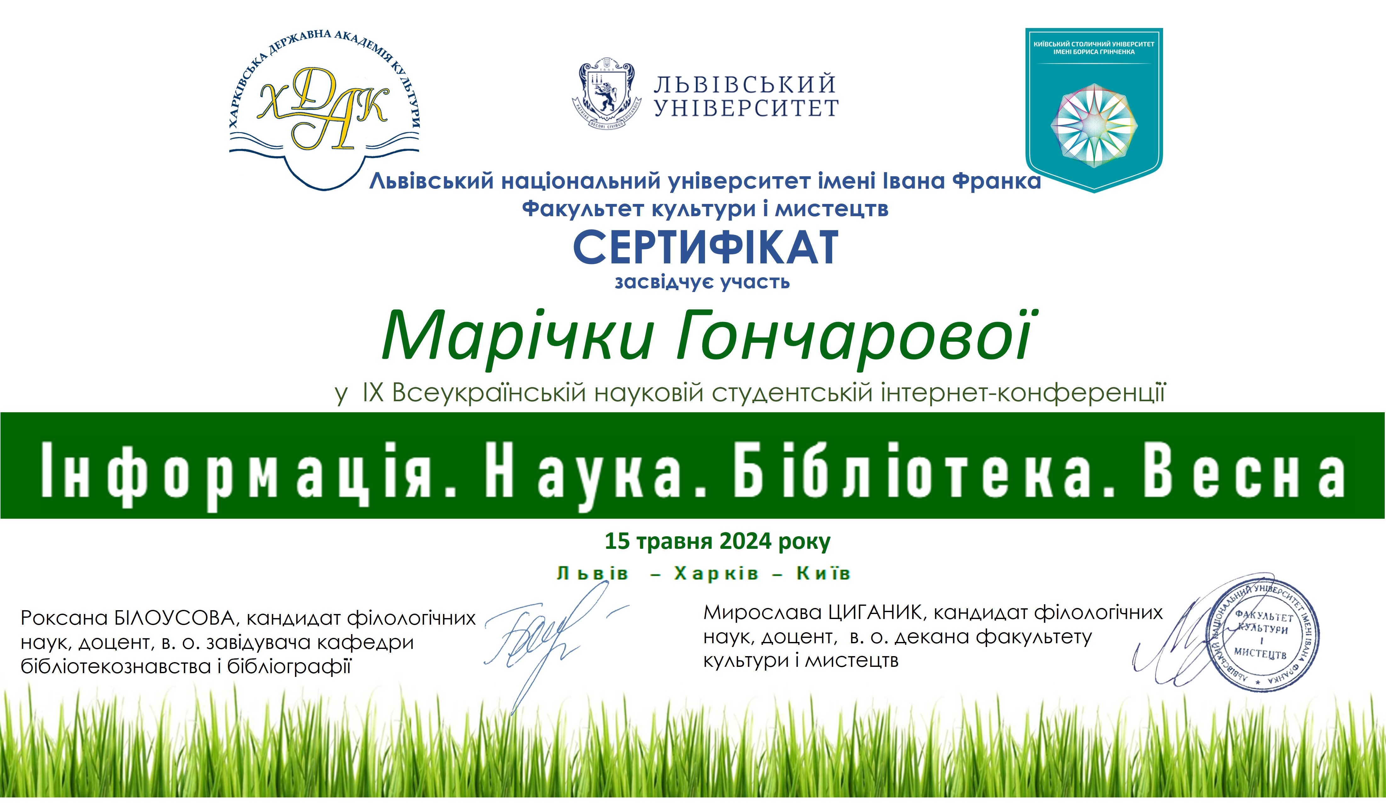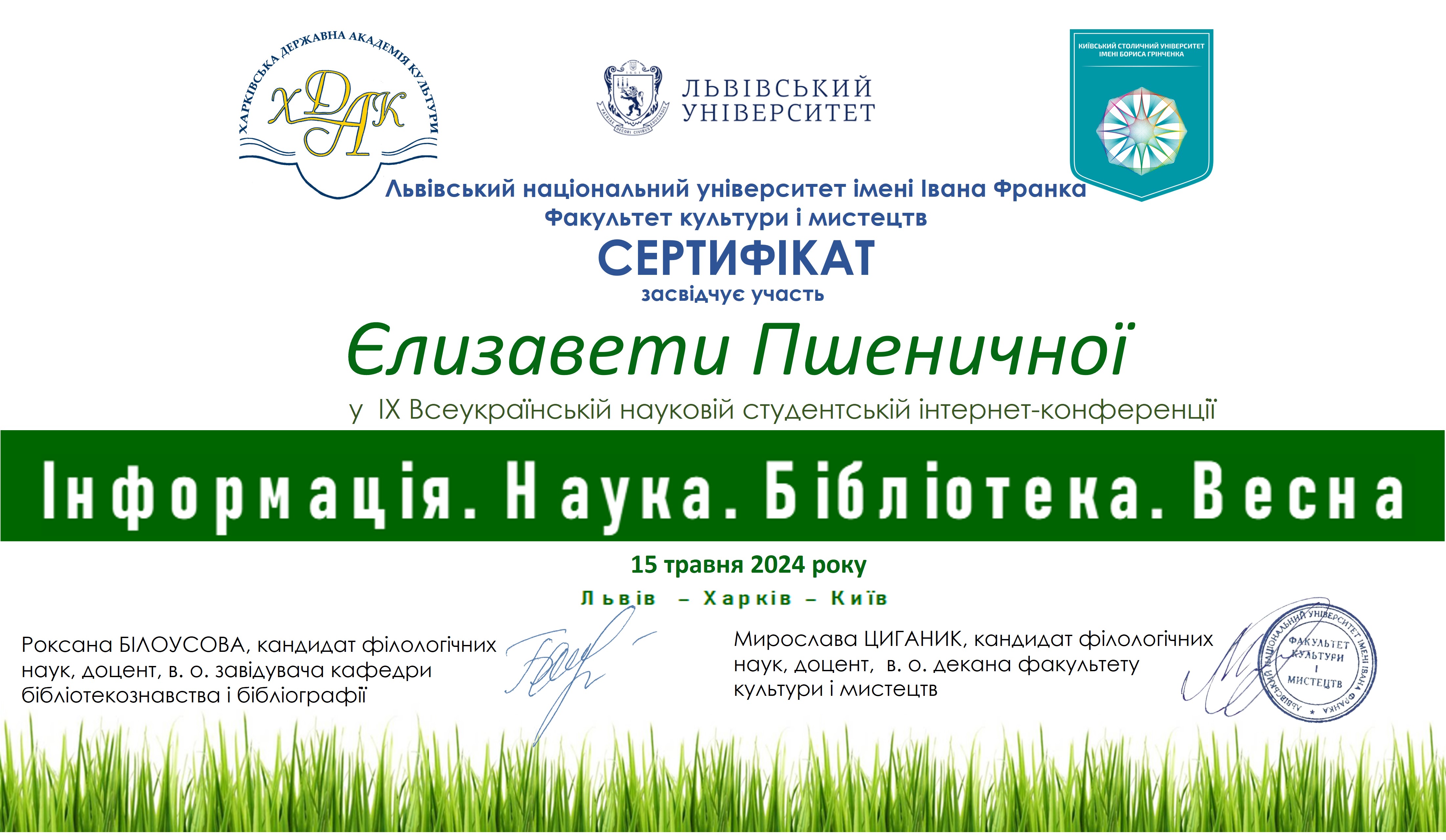 Отже, 15 травня 2024 р., представники кафедри інформаційних комунікацій – викладачі та здобувачі як співорганізатори та доповідачі взяли участь у проведенні IХ Всеукраїнської наукової студентської інтернет-конференції «Інформація. Наука. Бібліотека. Весна»!