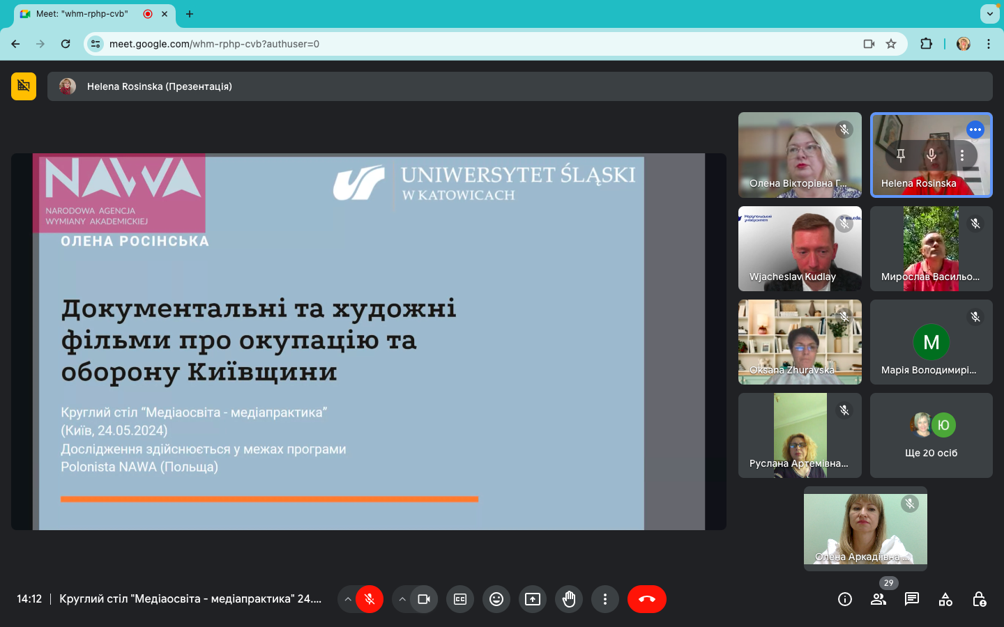 – дослідницька презентація Олени Росінської, доцента кафедри соціології Київського національного економічного університету, стипендіатки програми NAWA Polonista (Польща, Сілезький університет в Катовіце) «Оборона Київщини в українській та польській документалістиці»;
