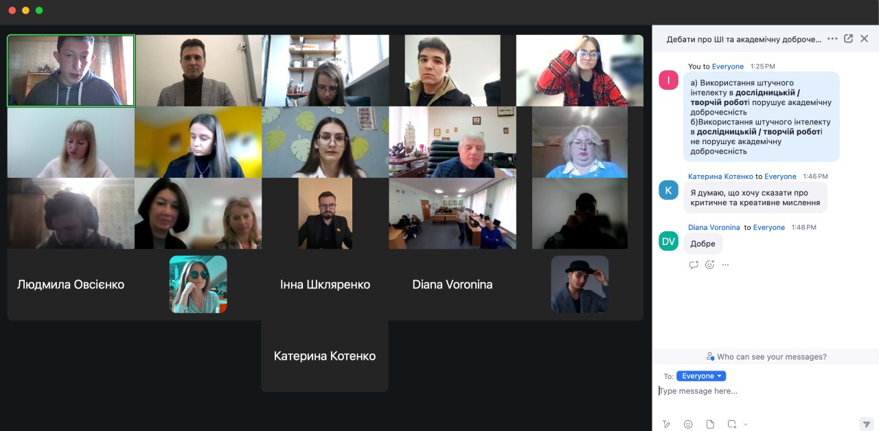 18 жовтня 2024 р. на Факультеті української філології, культури і мистецтва відбулися студентські наукові дебати, присвячені обговоренню позитивних і негативних наслідків використання технологій ШІ в науковій і творчій діяльності з позицій академічної доброчесності. Організаторами дебатів стали науково-педагогічні працівники кафедри інформаційних комунікацій Університету Грінченка у партнерстві з колегами кафедри інформаційної діяльності та медіакомунікацій Національного університету «Одеська політехніка».
