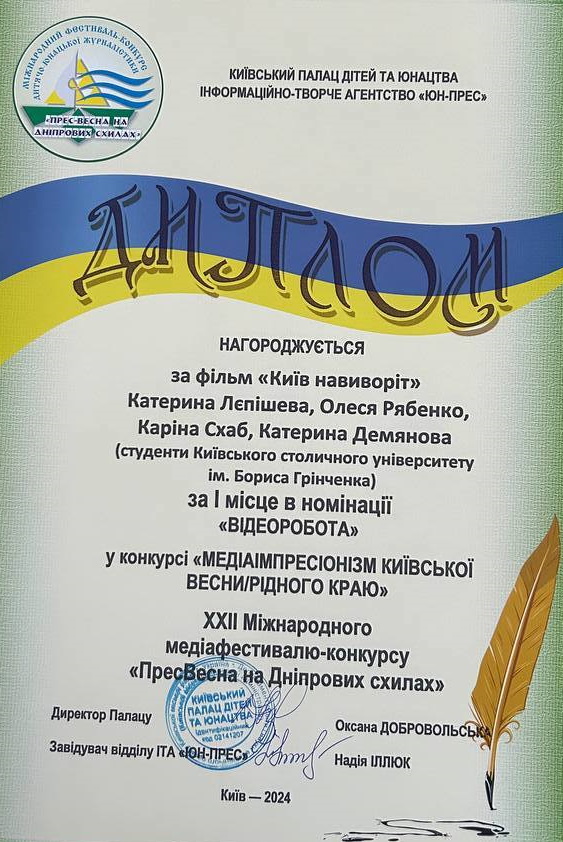 - І місце отримала команда студентів у складі Катерини Лепішевої, Олесі Рябенко, Каріни Схаб, Катерини Демянової за фільм «Київ навиворіт» в номінації «Відеоробота» у конкурсі «Медіаімпресіонізм Київської весни/рідного краю» ХХІІ Міжнародного медіафестивалю-конкурсу «ПресВесна на Дніпрових схилах».