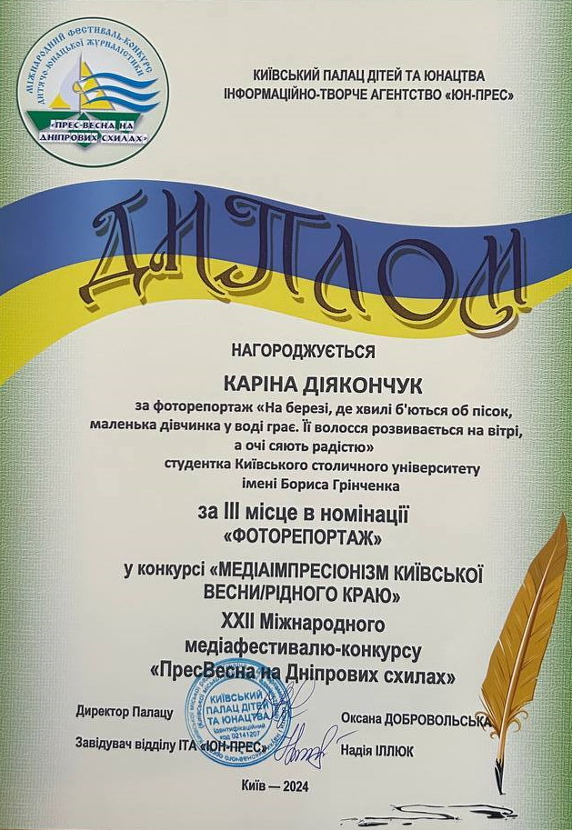 - ІІІ місце отримала Каріна Діякончук за фоторепортаж «На березі, де хвилі б’ються об пісок, маленька дівчинка у воді грає. ЇЇ волосся розвивається на вітрі. А очі сяють радістю»» в номінації «Фоторепортаж» у конкурсі «Медіаімпресіонізм Київської весни/рідного краю» ХХІІ Міжнародного медіафестивалю-конкурсу «ПресВесна на Дніпрових схилах».